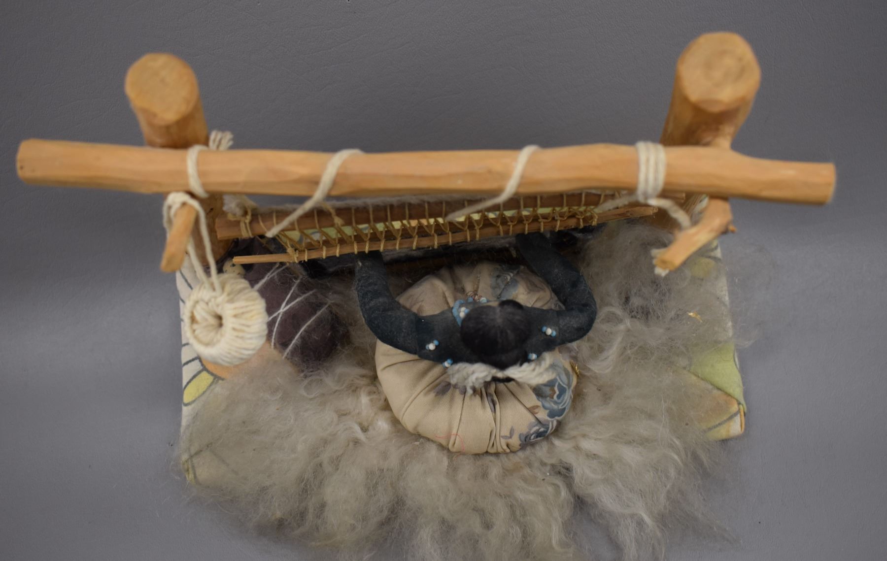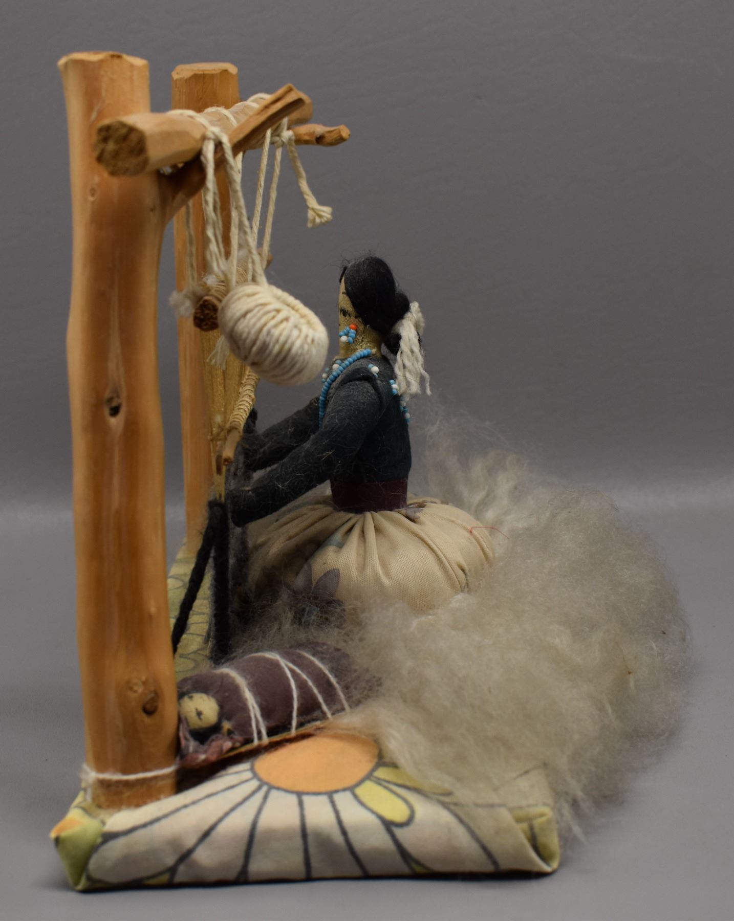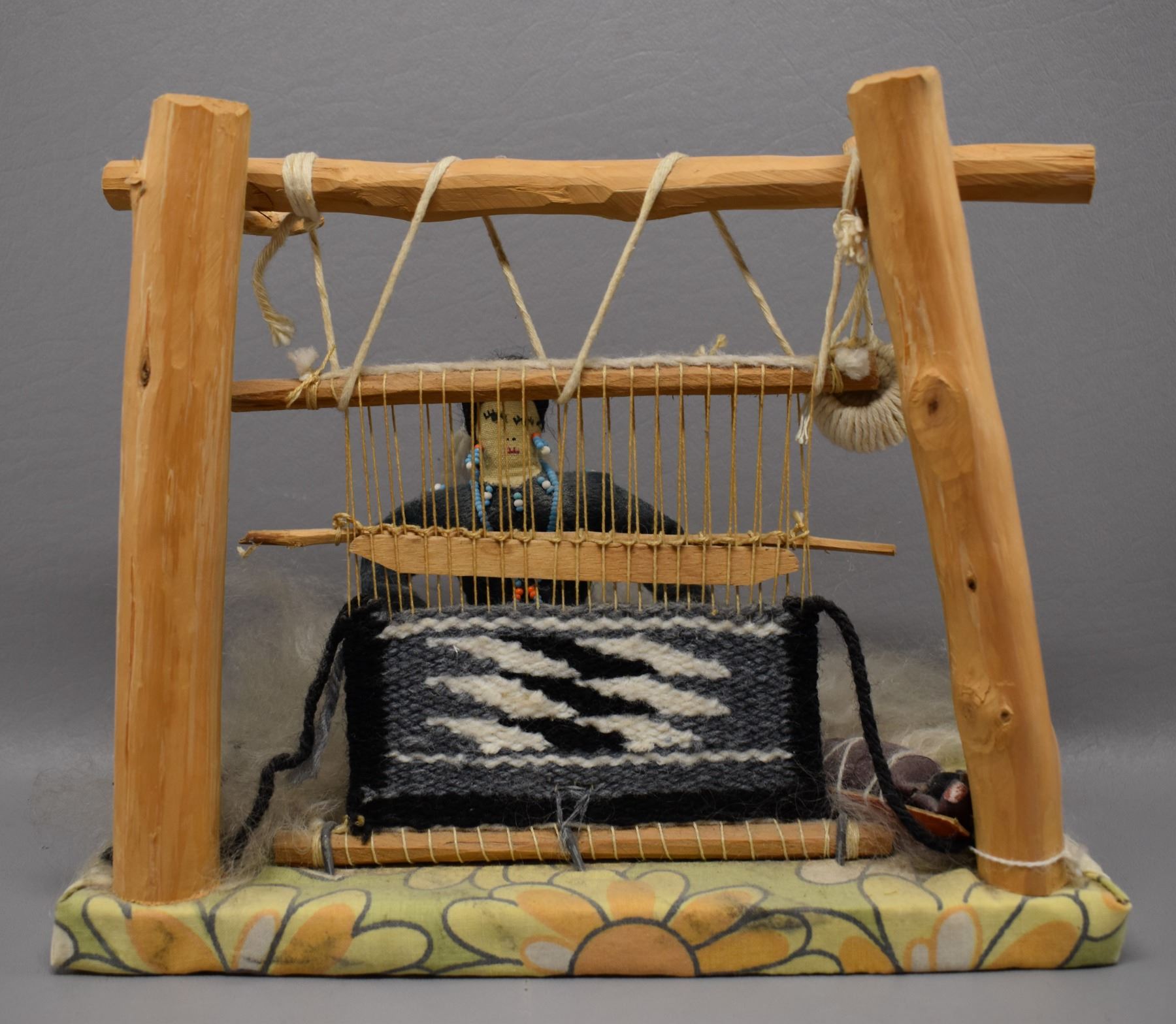 1980-90's Navajo Indian hand made woman and baby in cradle with hand made wooden loom with miniature weaving 10" x 4.75" x 8.5" has tag "Made by American Indians"