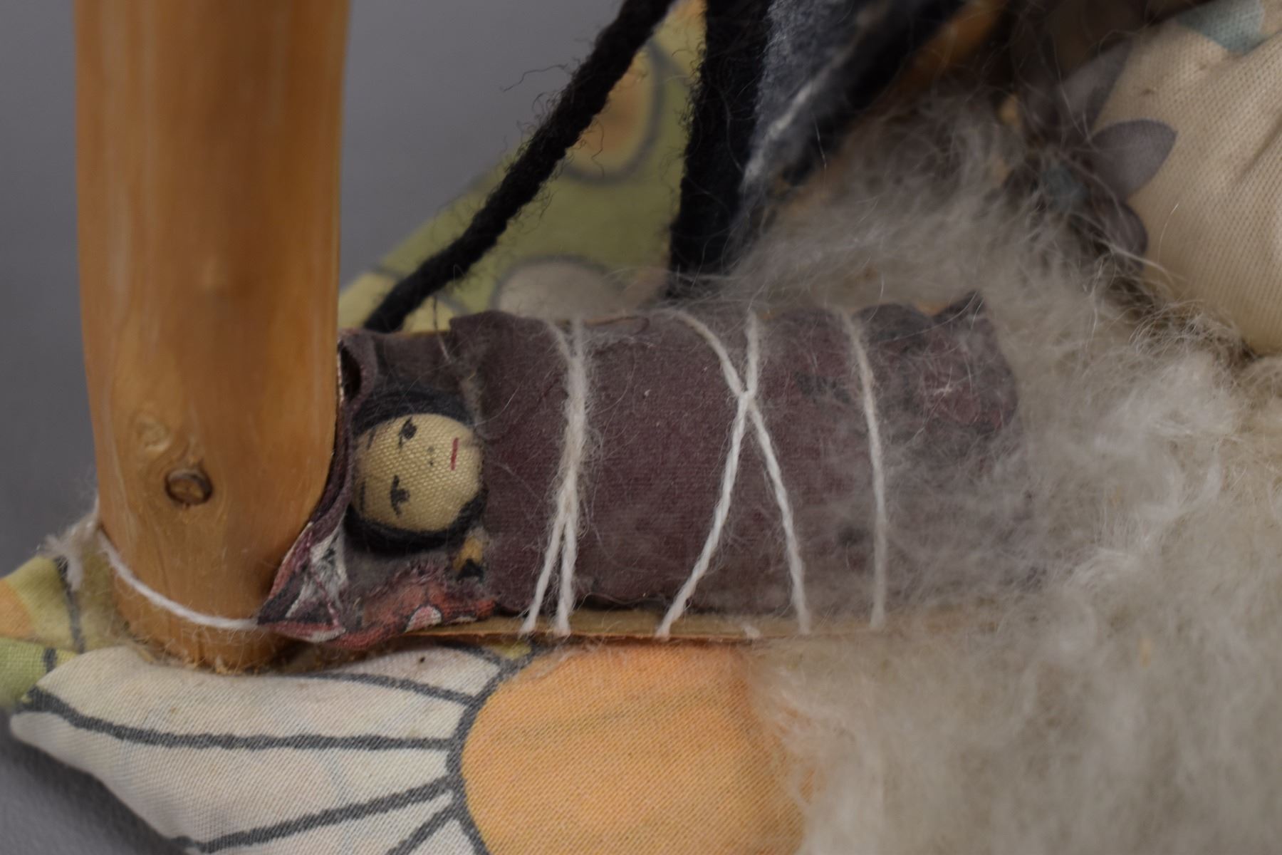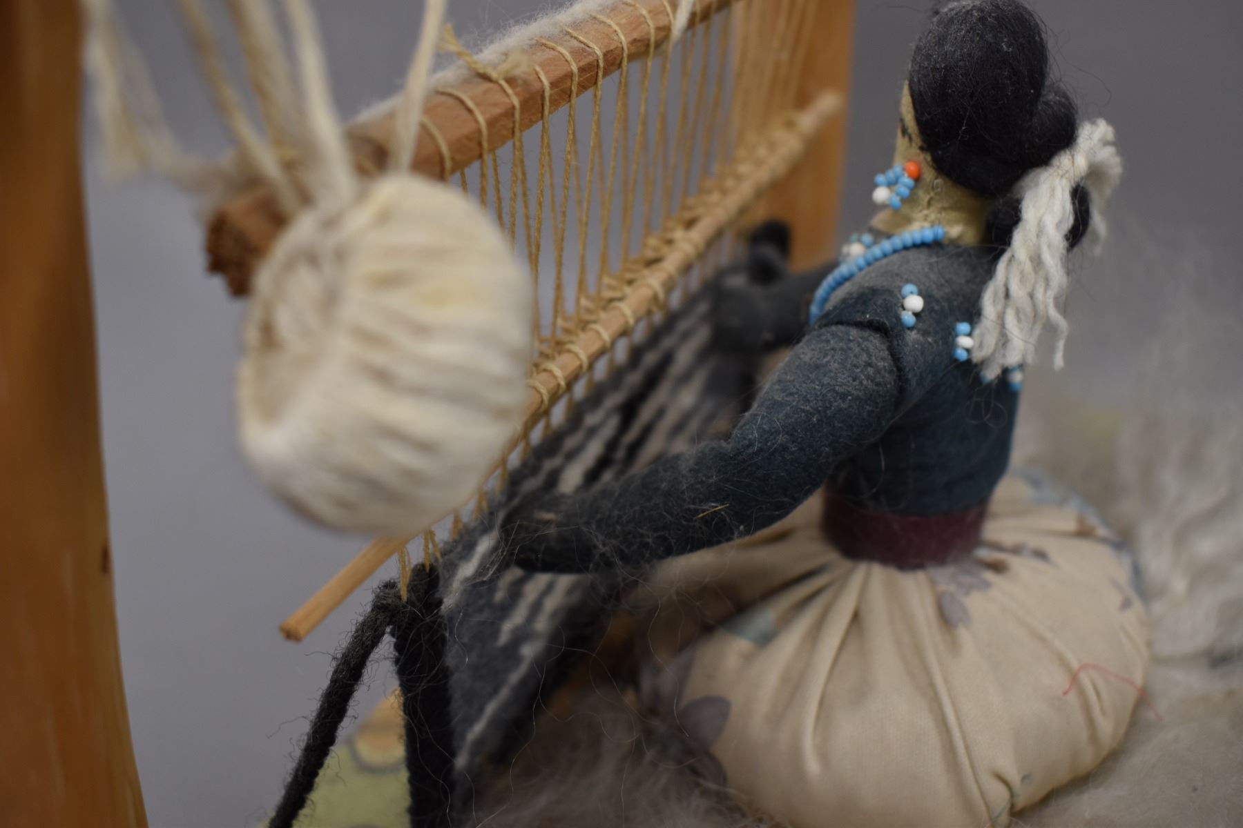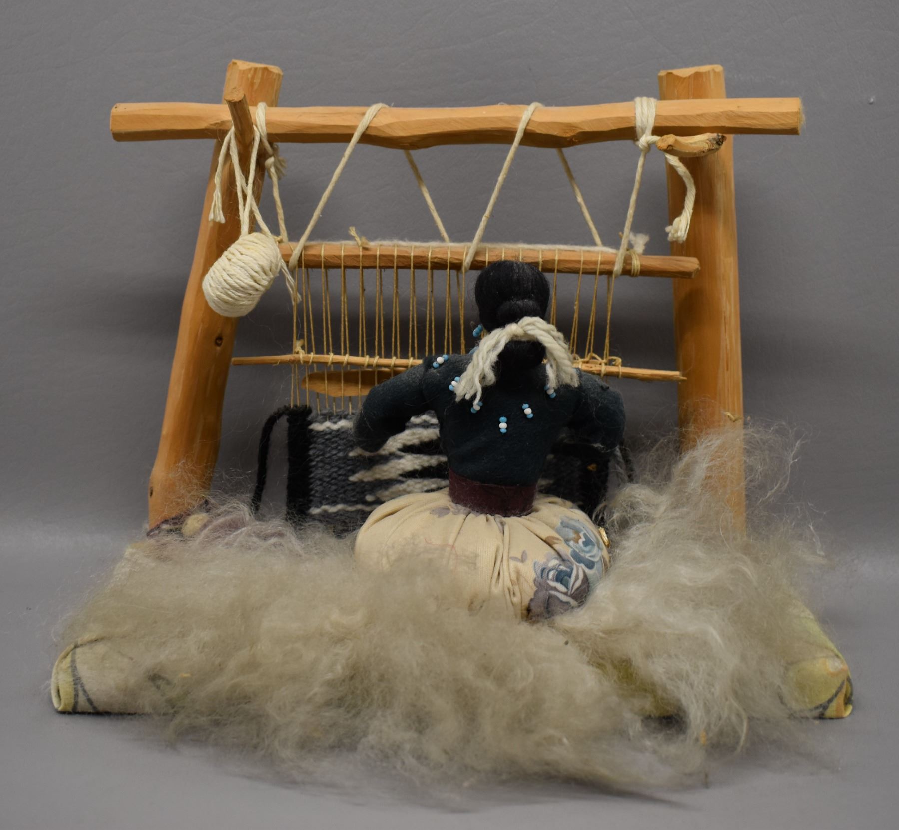 1980-90's Navajo Indian hand made woman and baby in cradle with hand made wooden loom with miniature weaving 10" x 4.75" x 8.5" has tag "Made by American Indians"