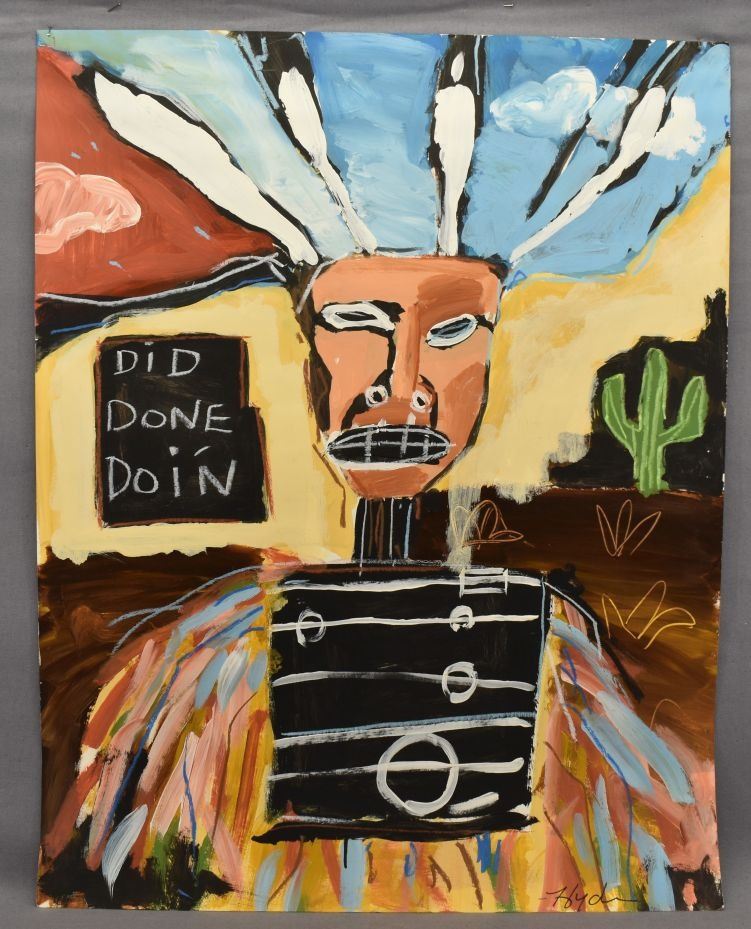1990-2000's nez Perce Indian hand painted on paper "Did Done Doin" by Frank Buffalo Hyde 28" x 22"