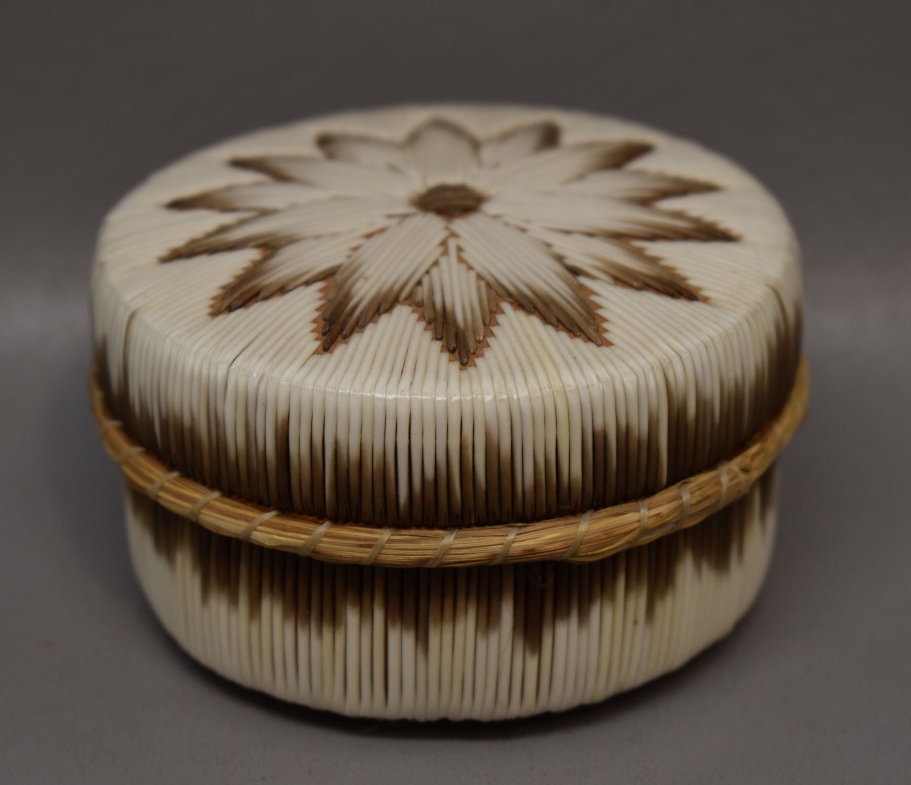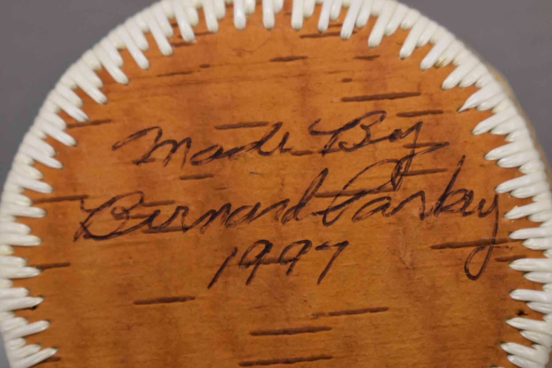 1997 Ojibwa Indian hand made from birch bark box with quilled star design signed Benard Parkey 3.25" x 2"