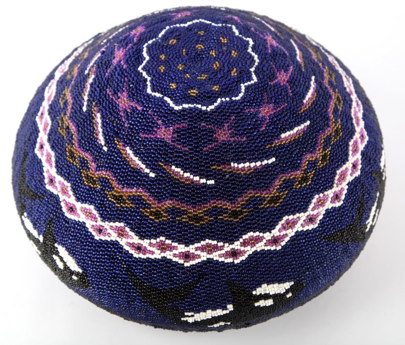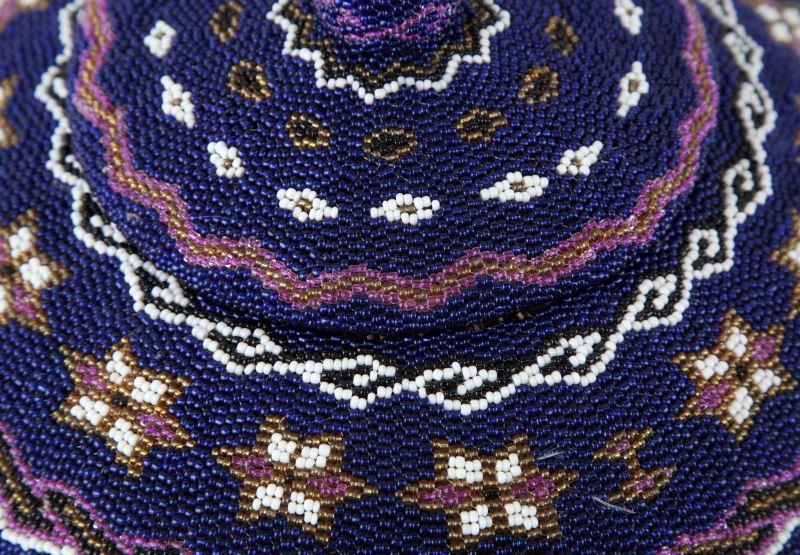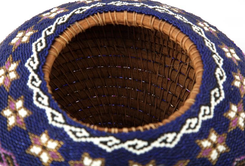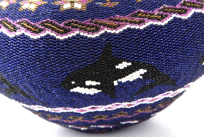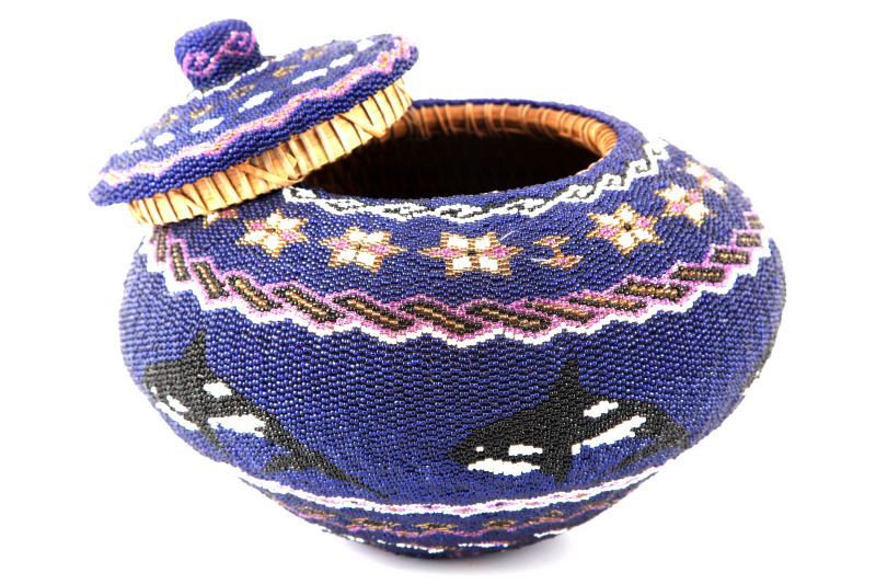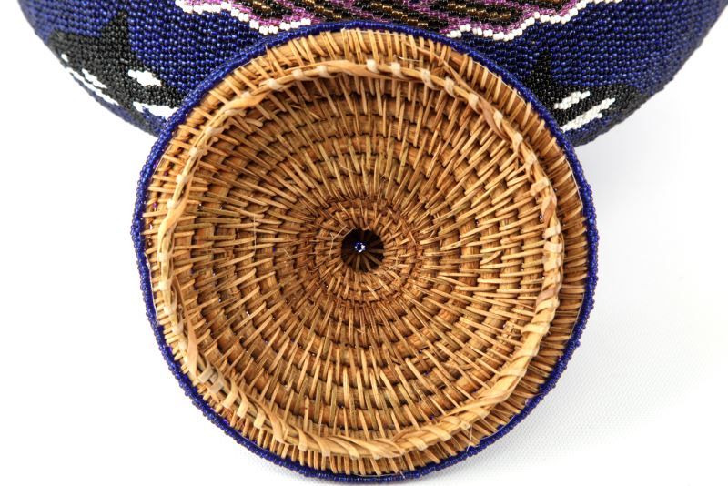 Fully beaded Paiute Indian knob top gift basket. Cobalt, black, purple, gold, and white beads in geometric patterns and images of Orcas around the middle.