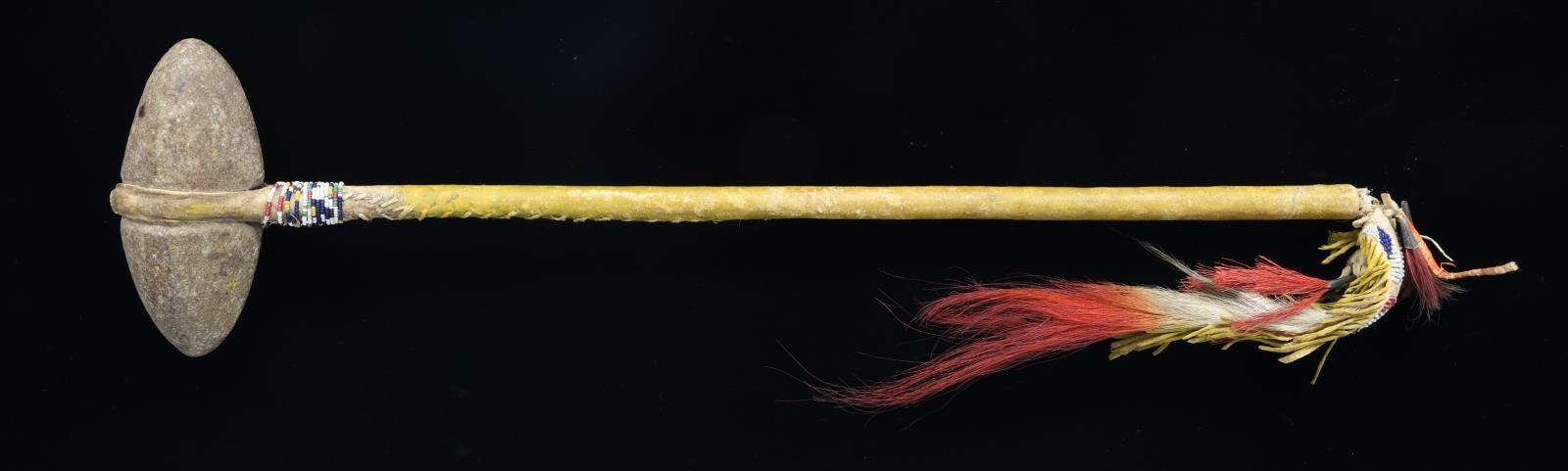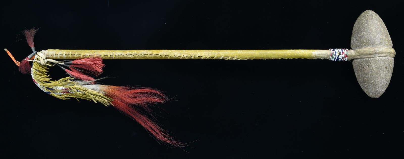 24" overall, 6" double pointed central grooved stone head rawhide attached to wooden handle with rawhide wrapped handle. Beaded decoration around haft and on 2 rawhide fringed drops with tinkle cones and dyed horse hair. Mr. Mattox's collection tag states dates from 1890/1900. CONDITION: very good overall, one drop is detached. PROVENANCE: From the Lifelong Collection of Glen E. Mattox. (02-18790/JS). $300-500.