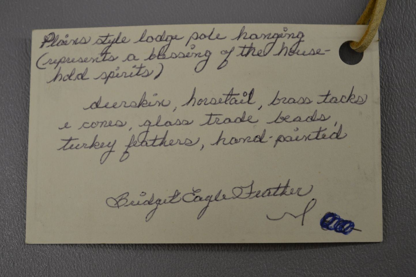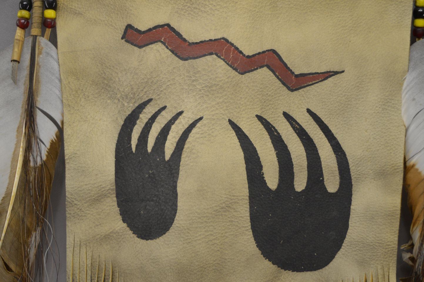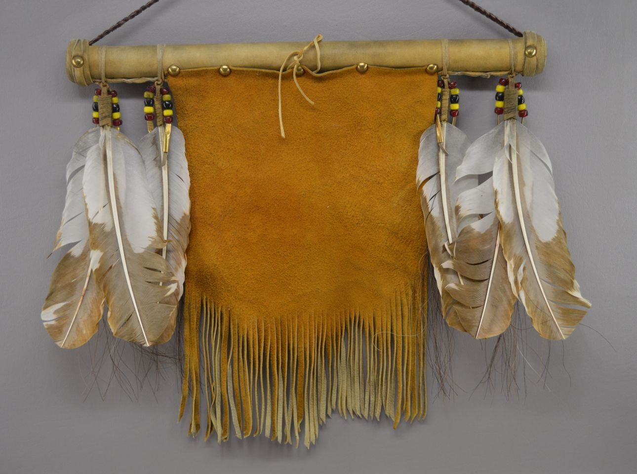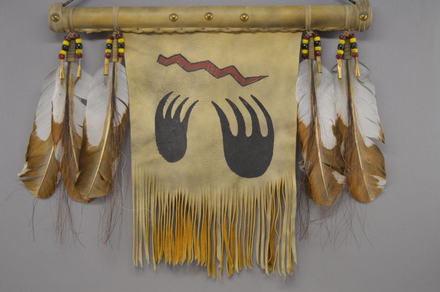 contemporary hand painted on comercial hide with bead and feather drops 18" x 15"