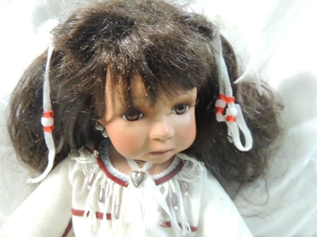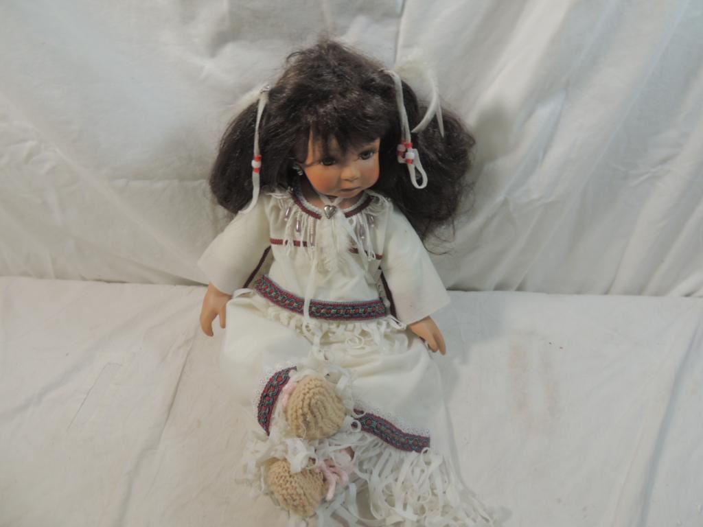 NATIVE AMERICAN PORCELAIN DOLL, COLLECTIBLE DOLL, VINTAGE DOLL, AMERICAN INDIAN DOLL, COLLECTORS DOLL AS SHOWN SEE PHOTO FOR MORE DETAILS.