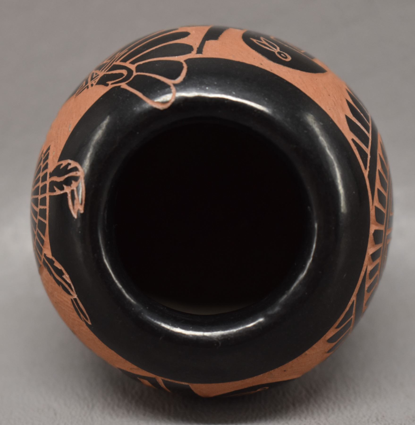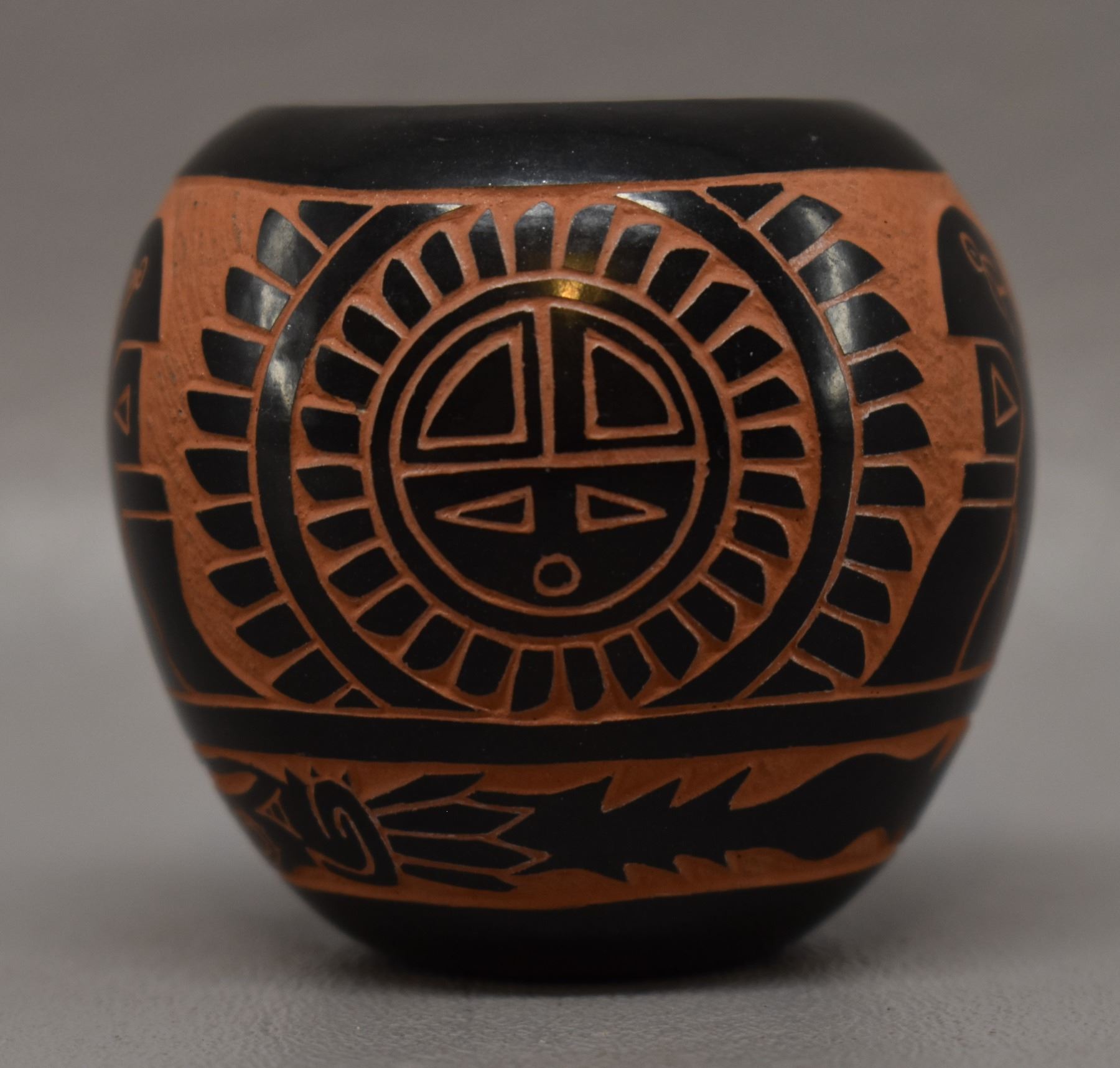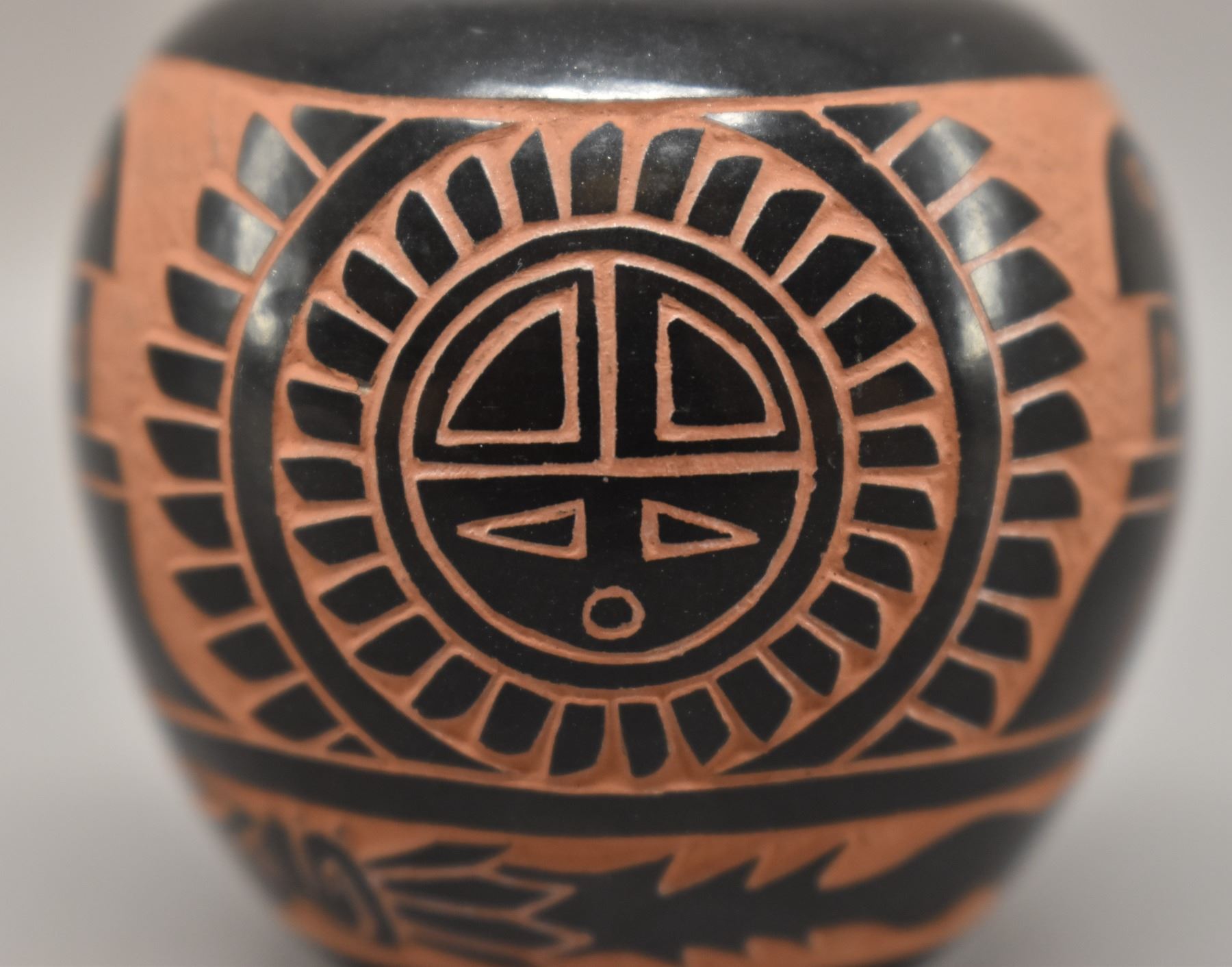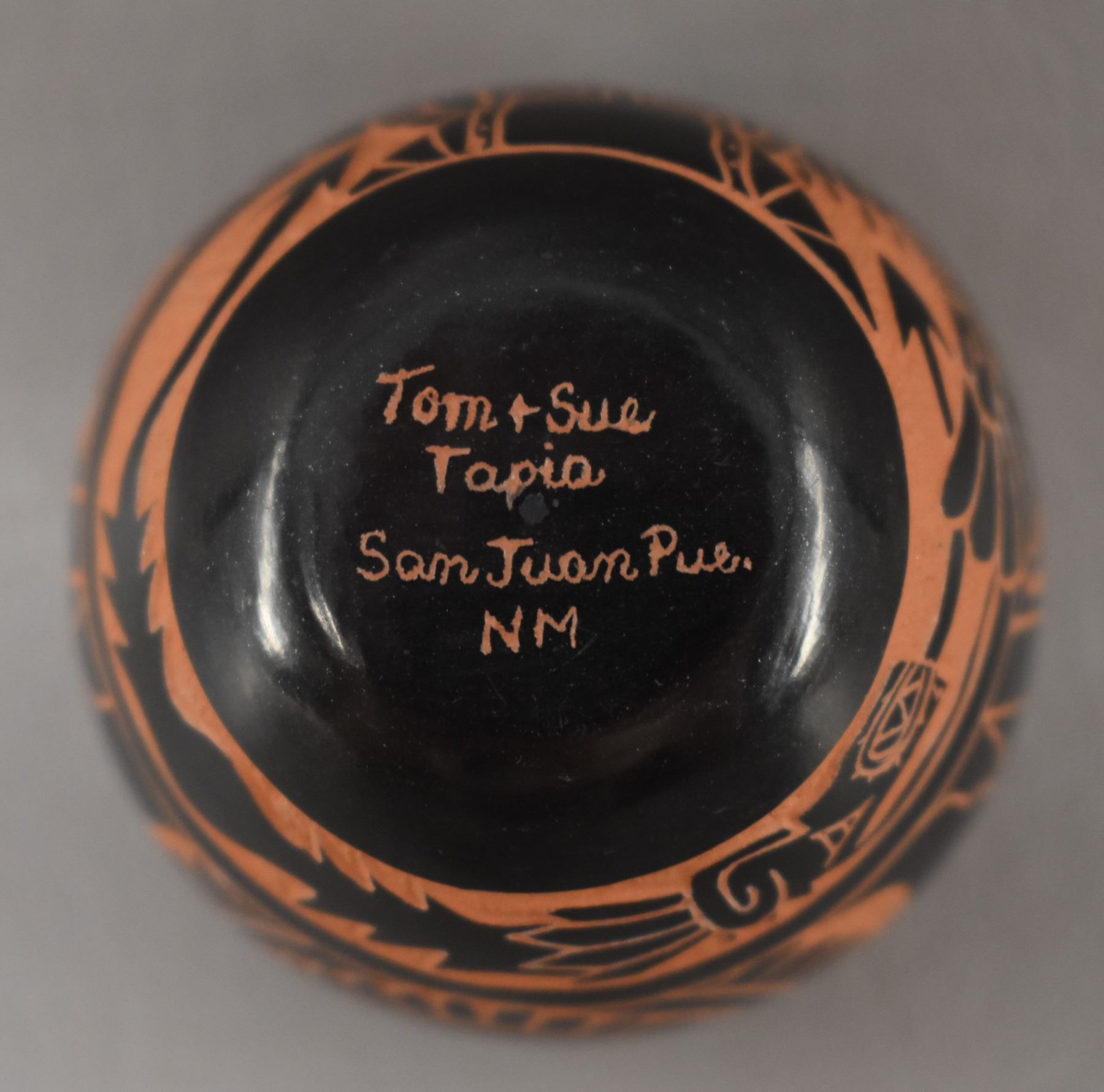 1990's San Juan Indian hand coiled with sgraffito design signed Tom and Sue Tapia 2" x 2"