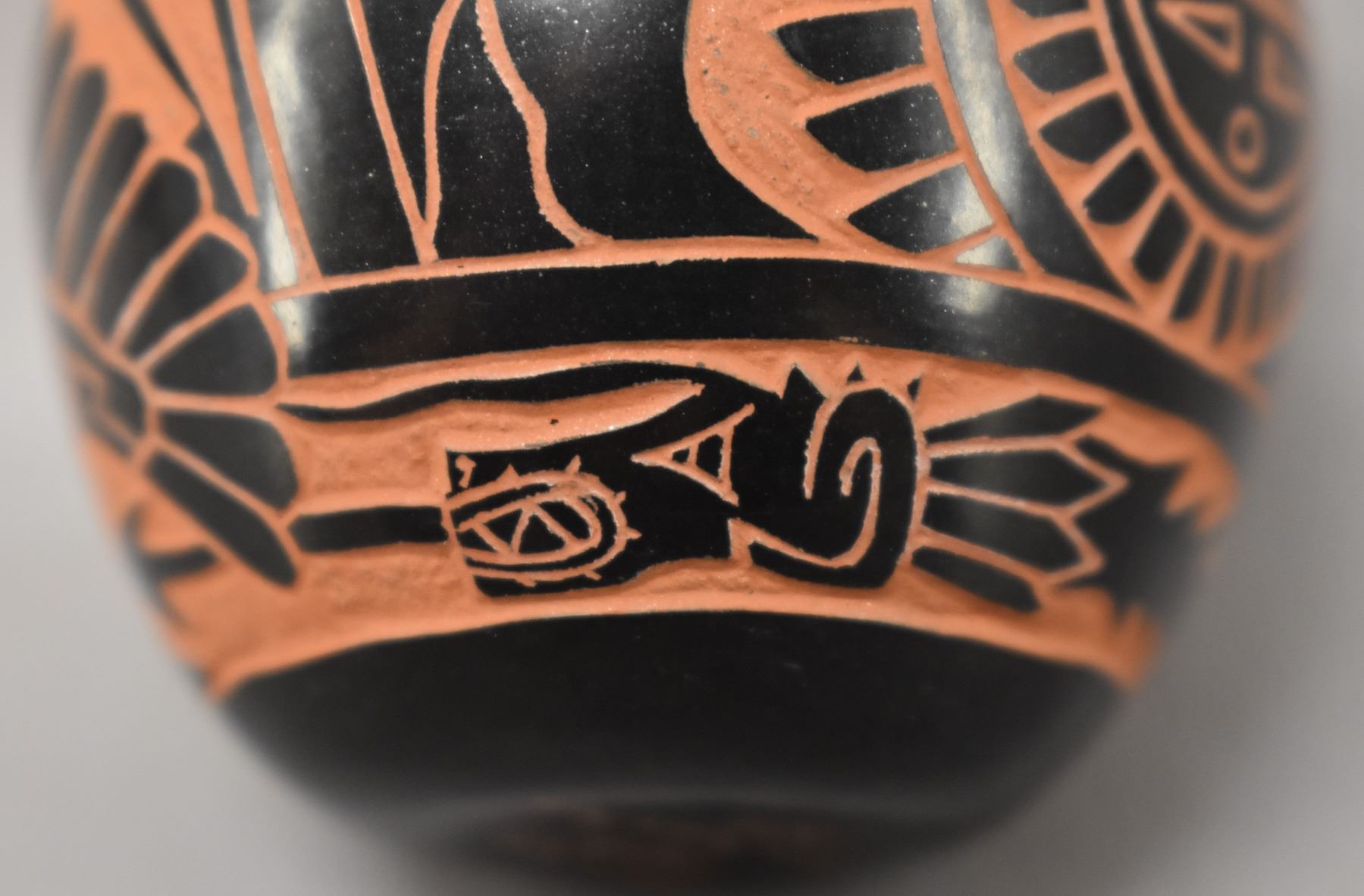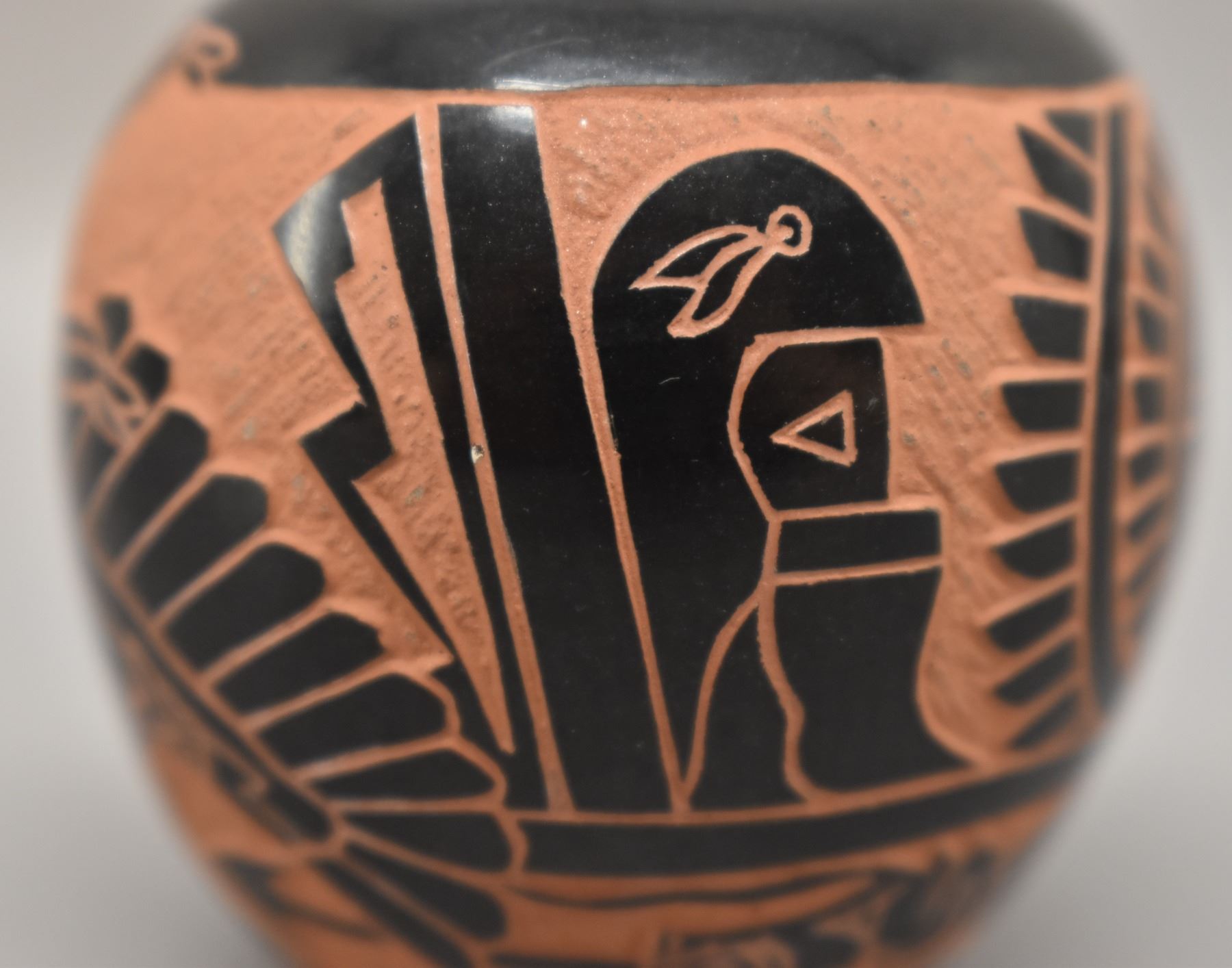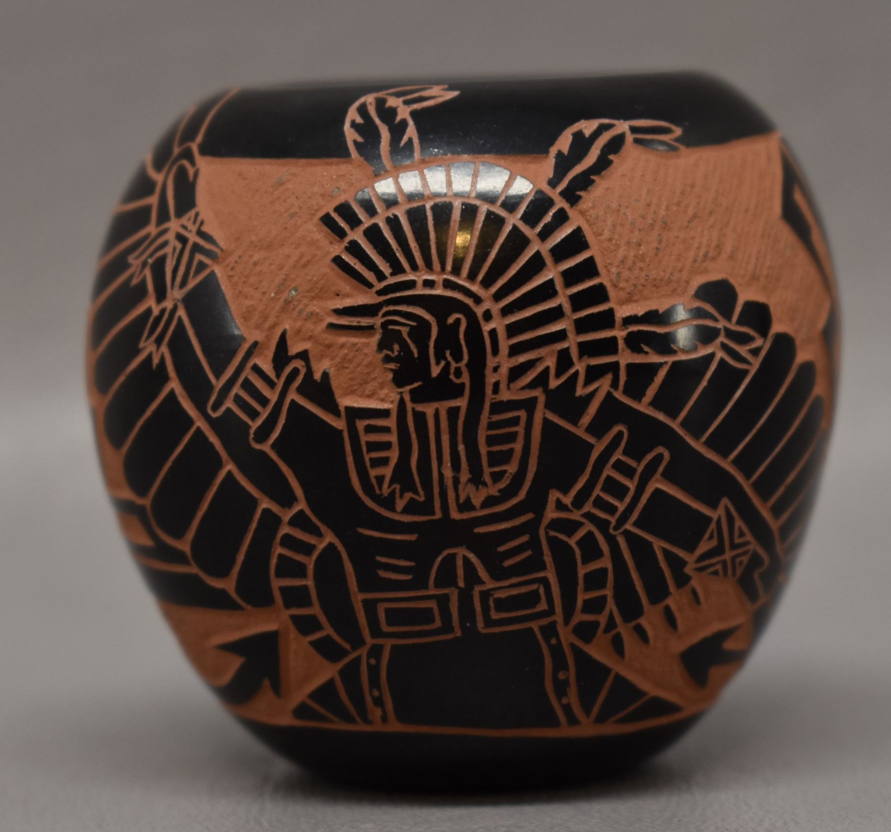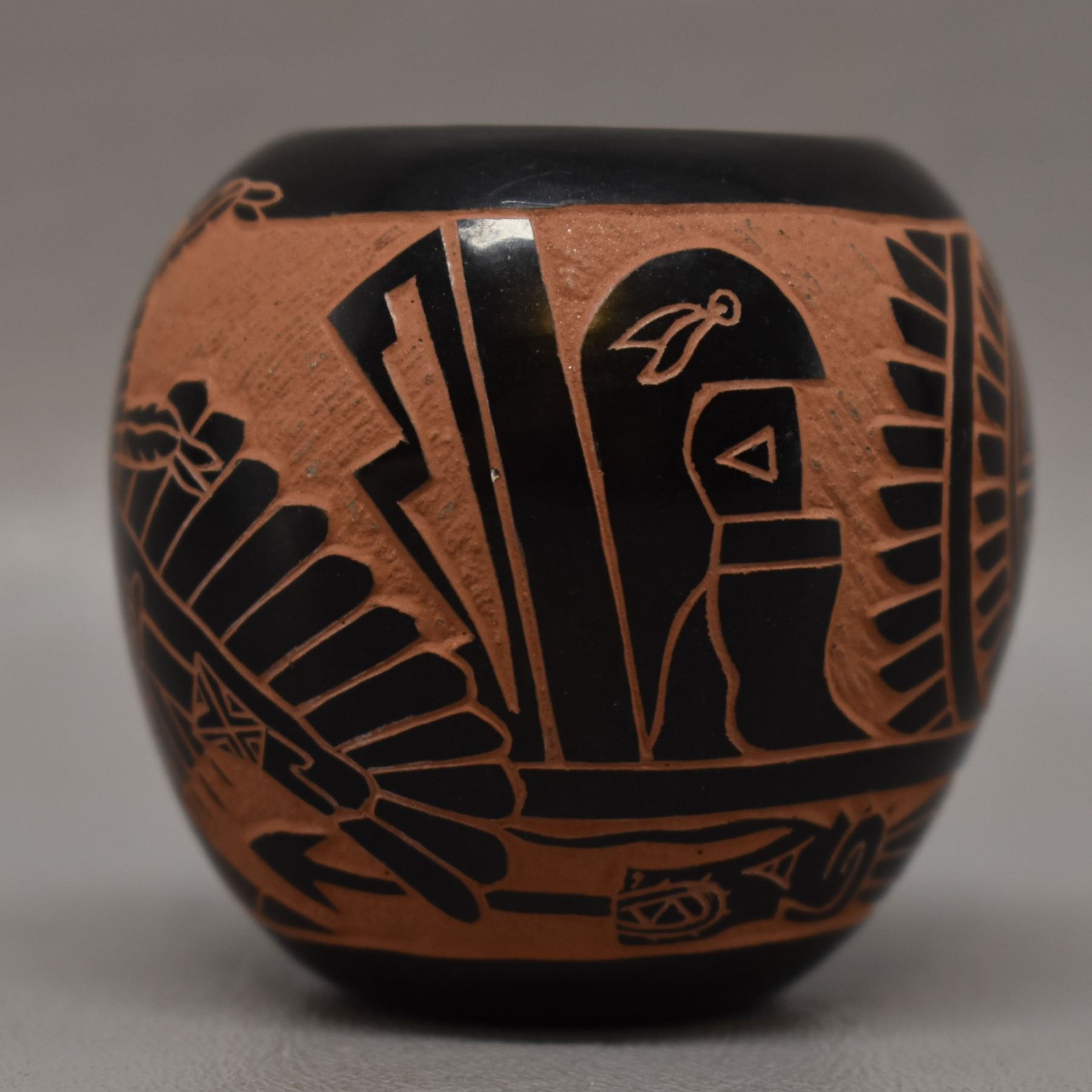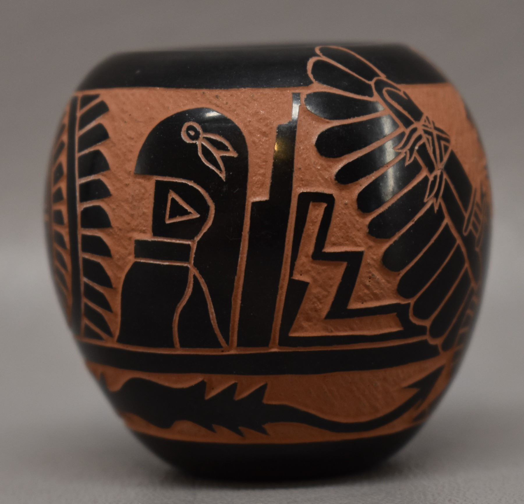 1990's San Juan Indian hand coiled with sgraffito design signed Tom and Sue Tapia 2" x 2"