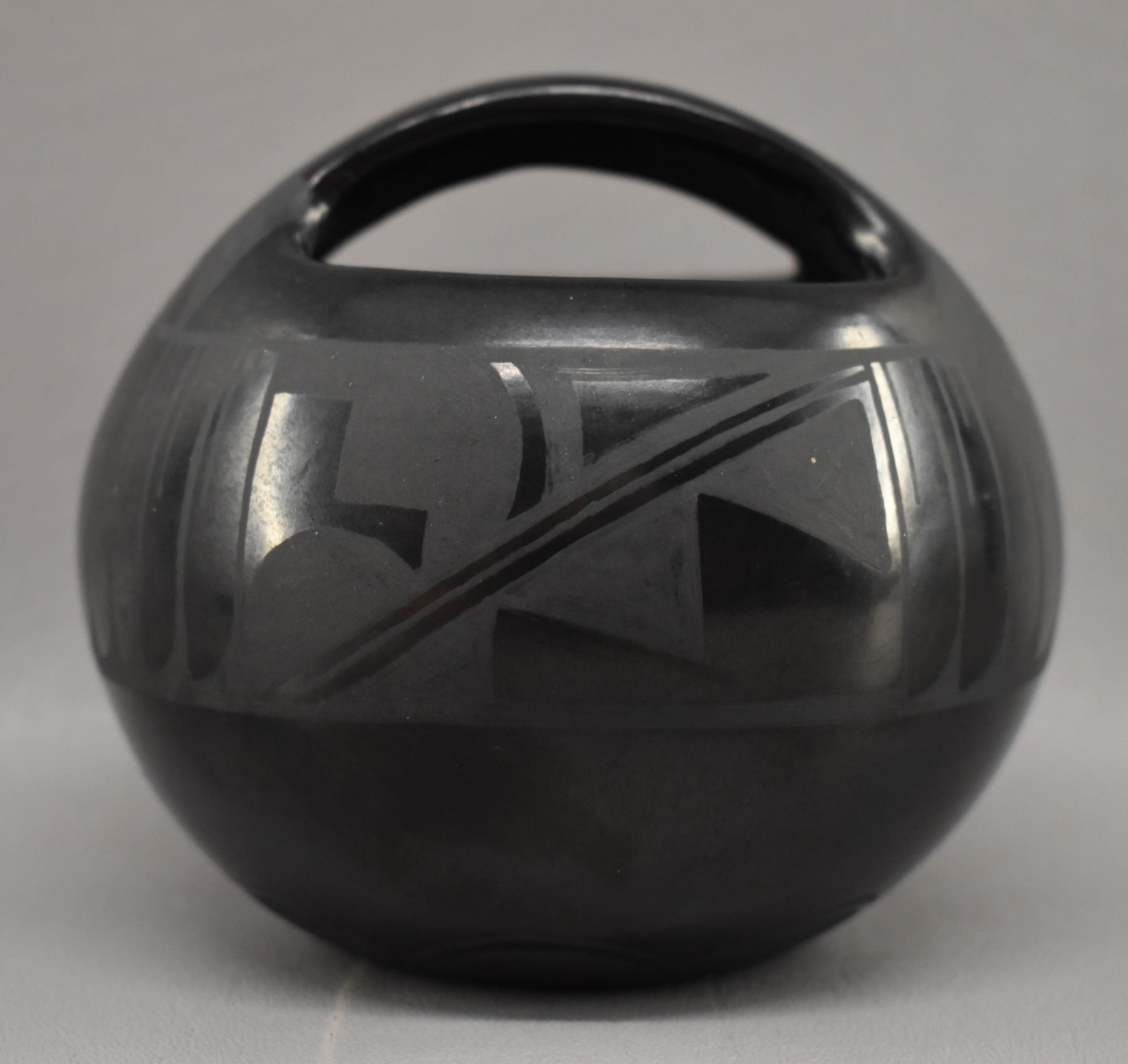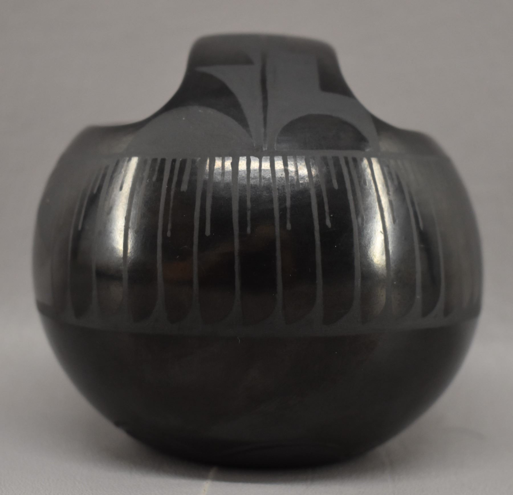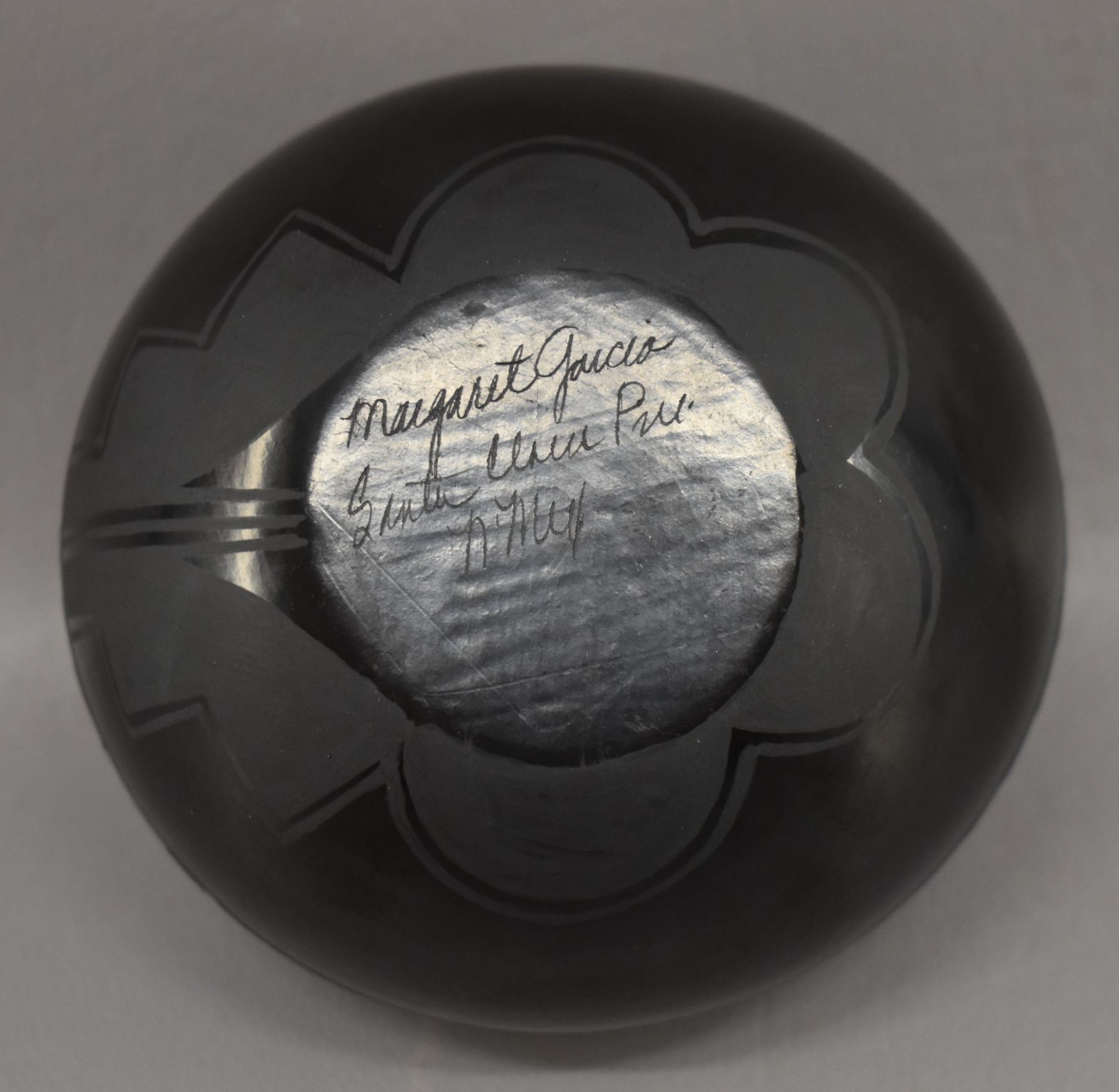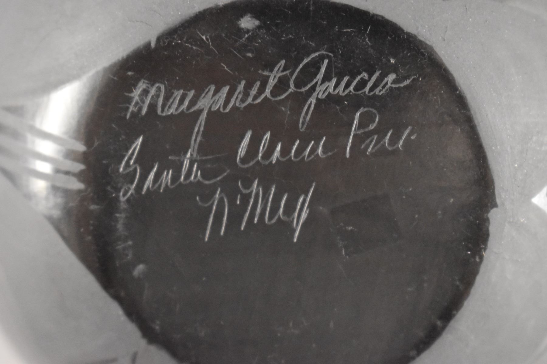 1980-90's Santa Clara Indian hand coiled and painted matte on black feather and geometric design signed Margaret Garcia 4.25" x 3.75"