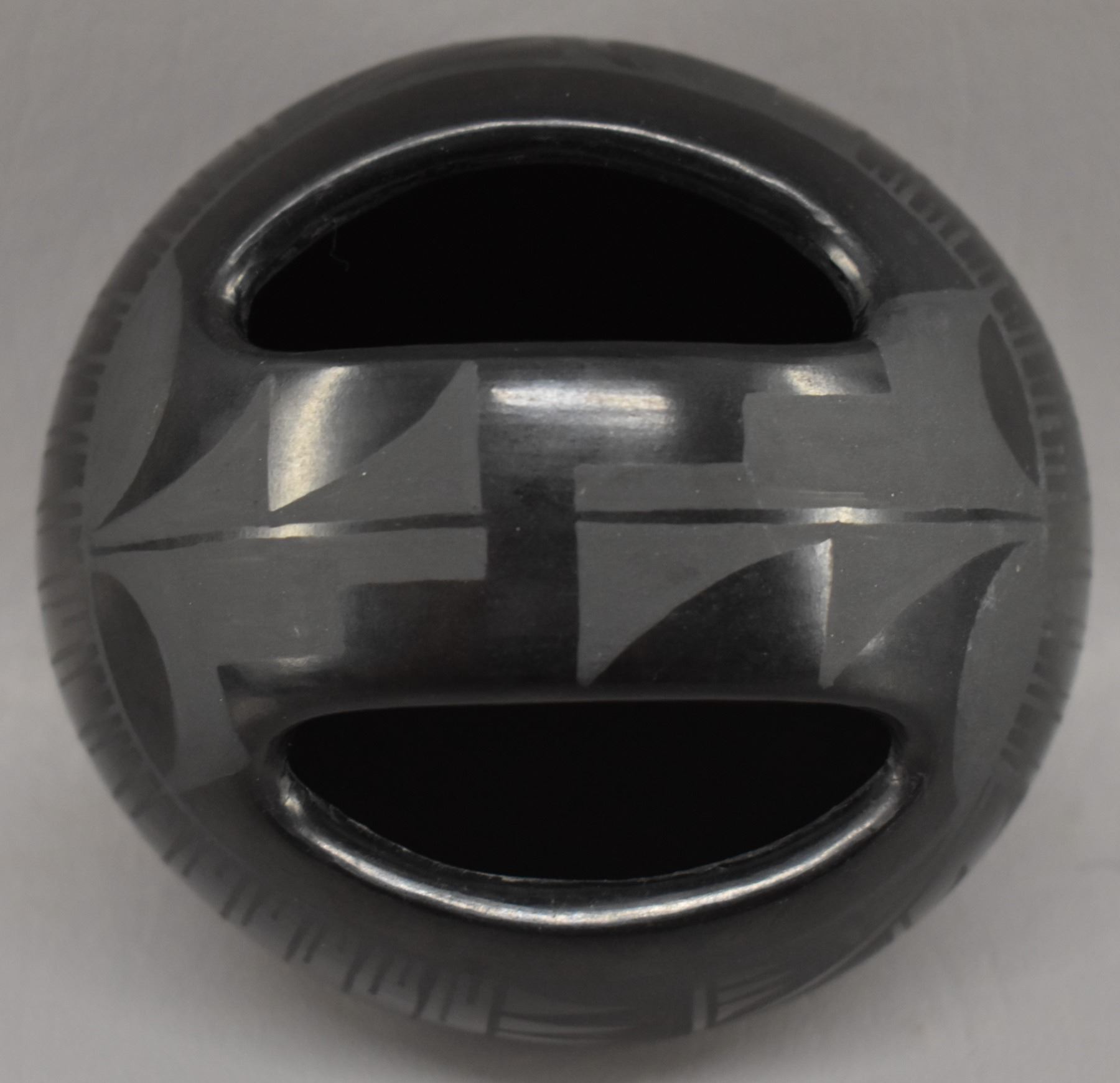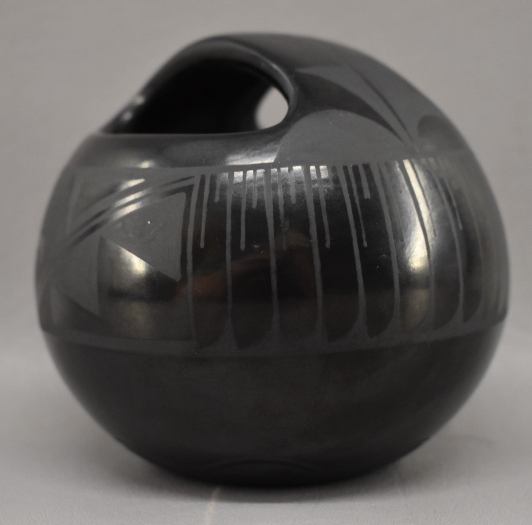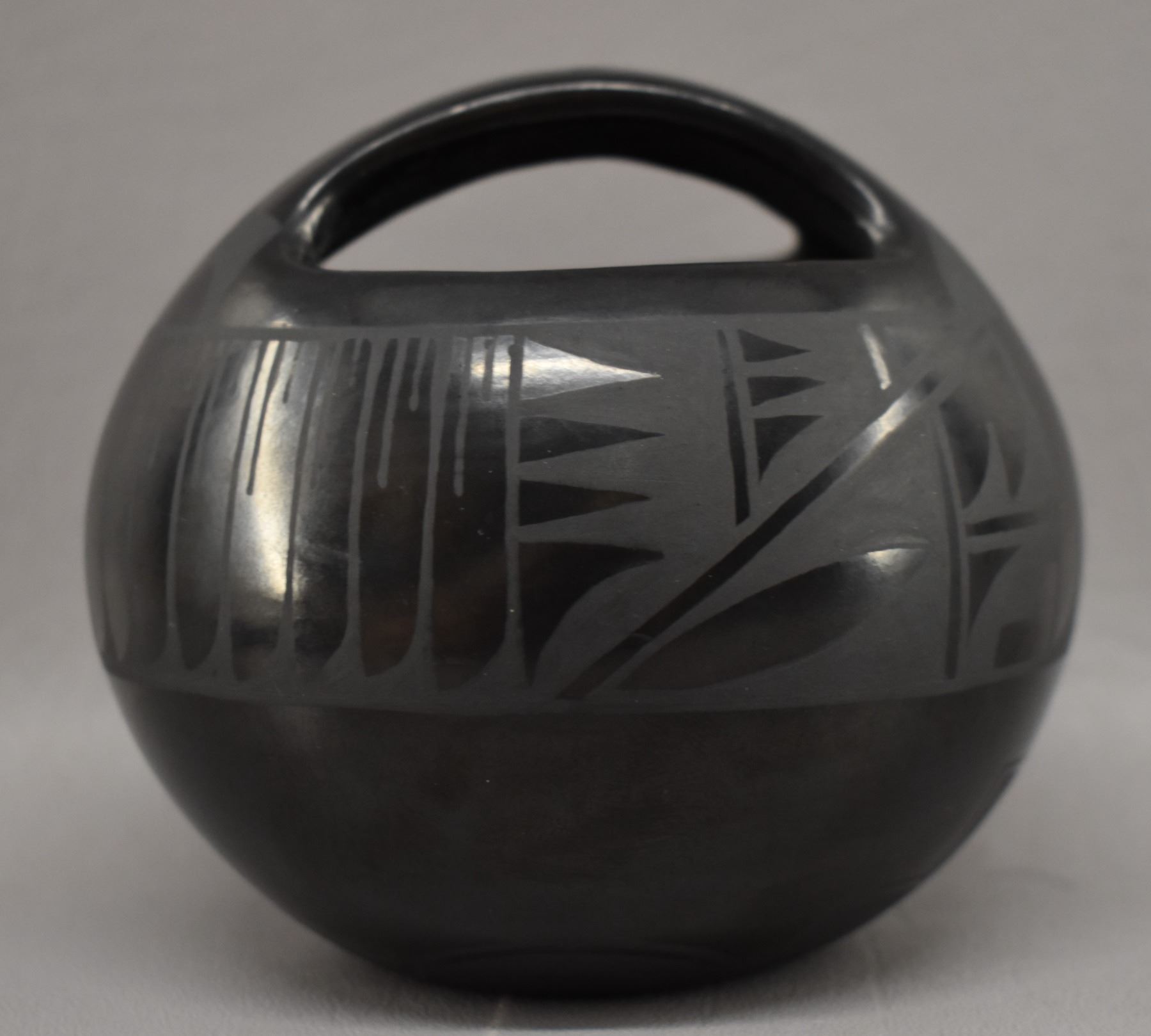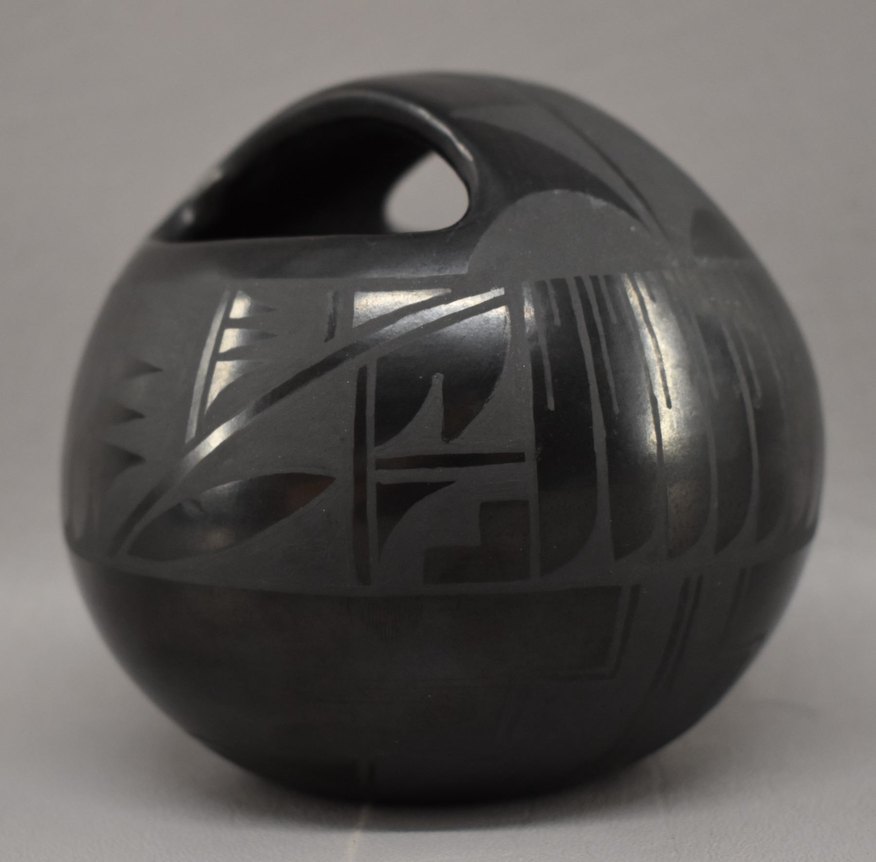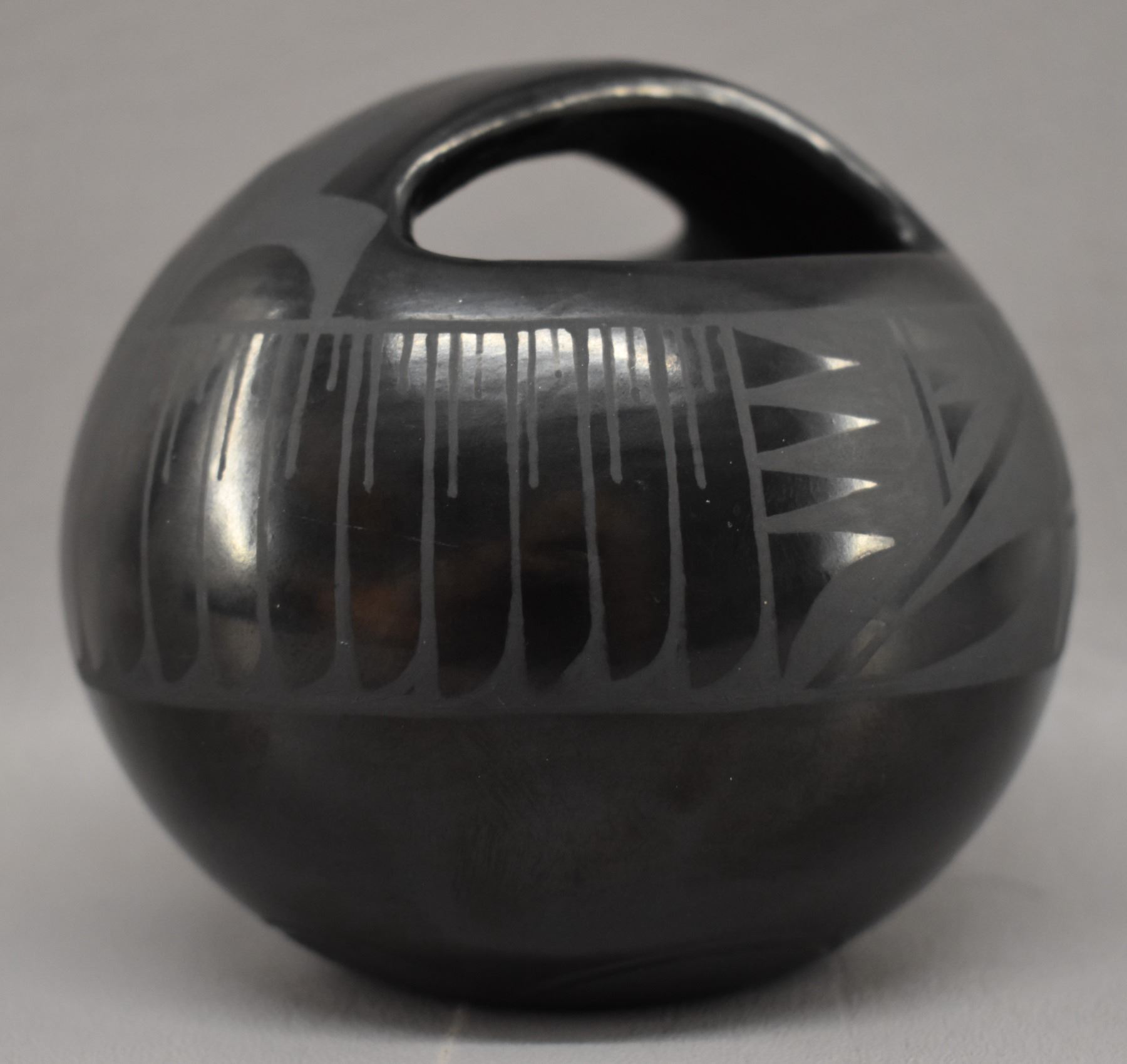 1980-90's Santa Clara Indian hand coiled and painted matte on black feather and geometric design signed Margaret Garcia 4.25" x 3.75"