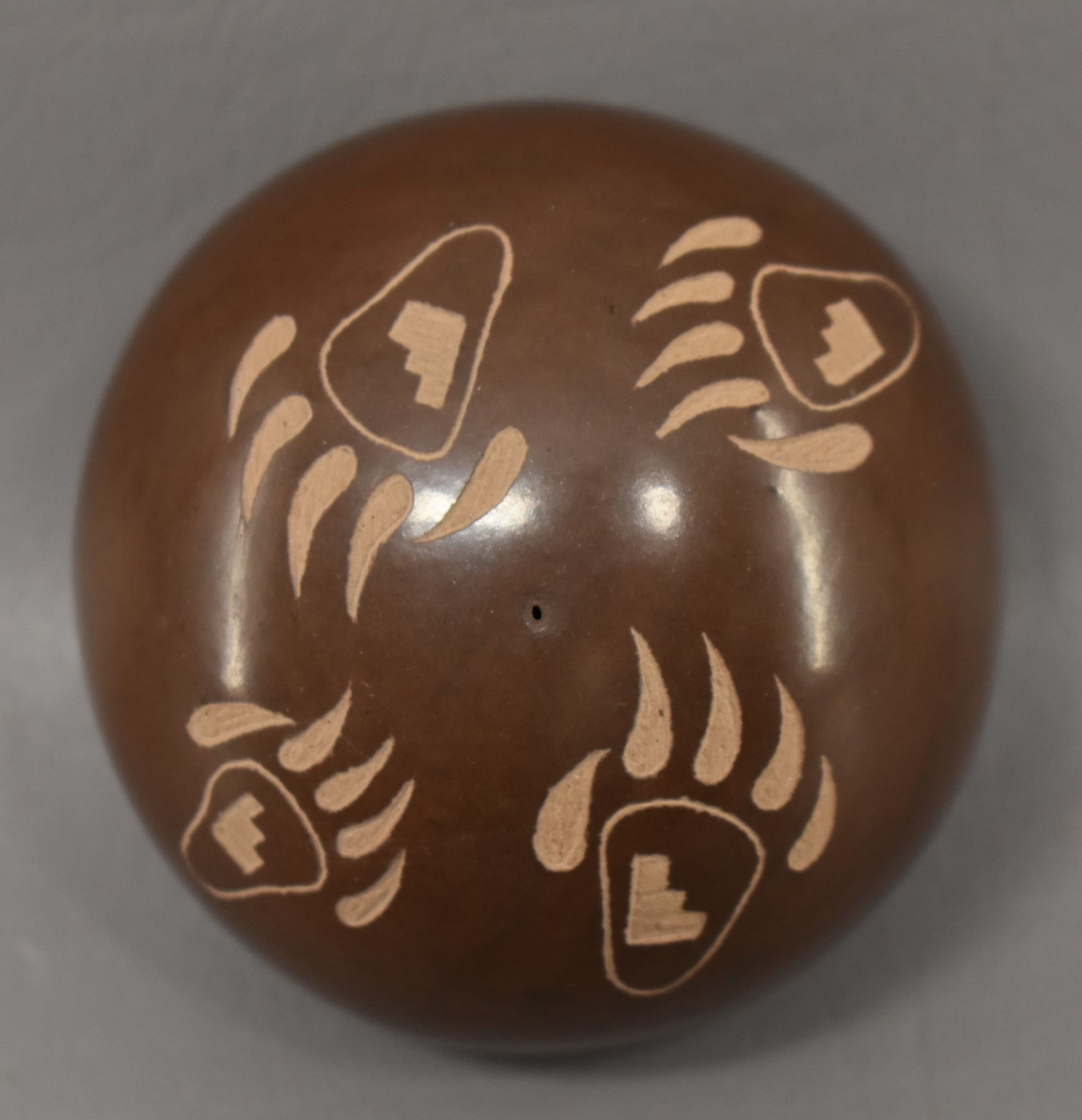 1990-2000's Santa Clara Indian hand coiled with sgraffito bear paw design signed C Nieto 2.75" x 2.25"