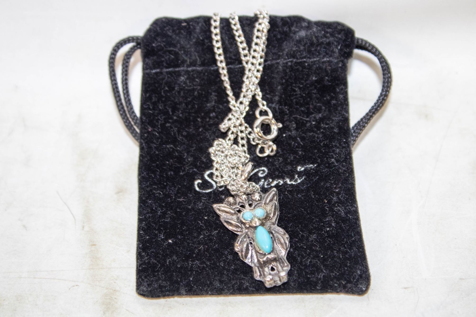 TURQUOISE PENDANT ON SILVER TONE NECKLACE IN JEWELRY POUCH
