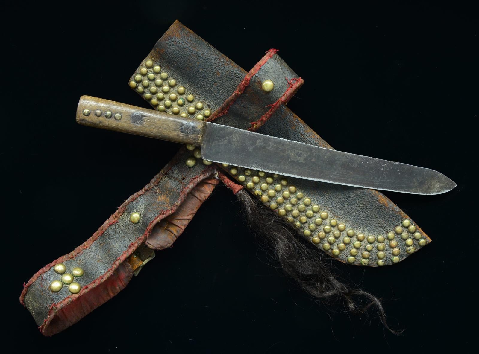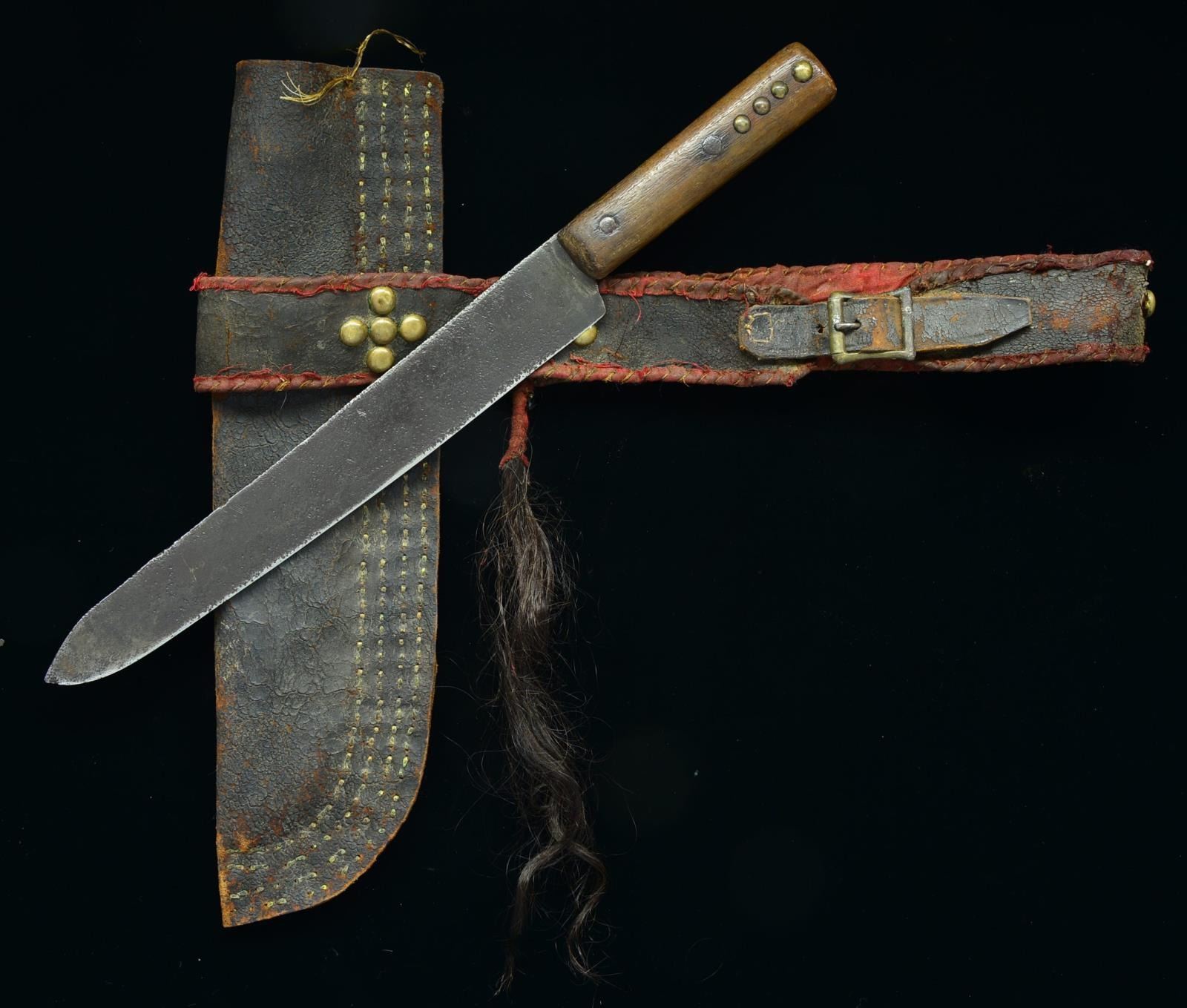 Overall length of knife: 17 1/4". Blade length: 11 3/4". Plain blade forged from an iron file. 1 Piece wood grip w/ 2 iron rivets on either side & 4 brass tacks on either side. Leather belt lined w/ red cloth & decorated w/ brass tacks. Sm. brass buckle. Leather sheath decorated w/ 122 brass tacks. CONDITION: blade has a dark patina. Wooden grip shows moderate wear & some staining. Belt & scabbard show moderate to heavy wear. Leather is partially flaked. Tacks have a deep mustard patina. Cloth belt lining is dirty & stained. (02-14006/BF). $600-1,200.