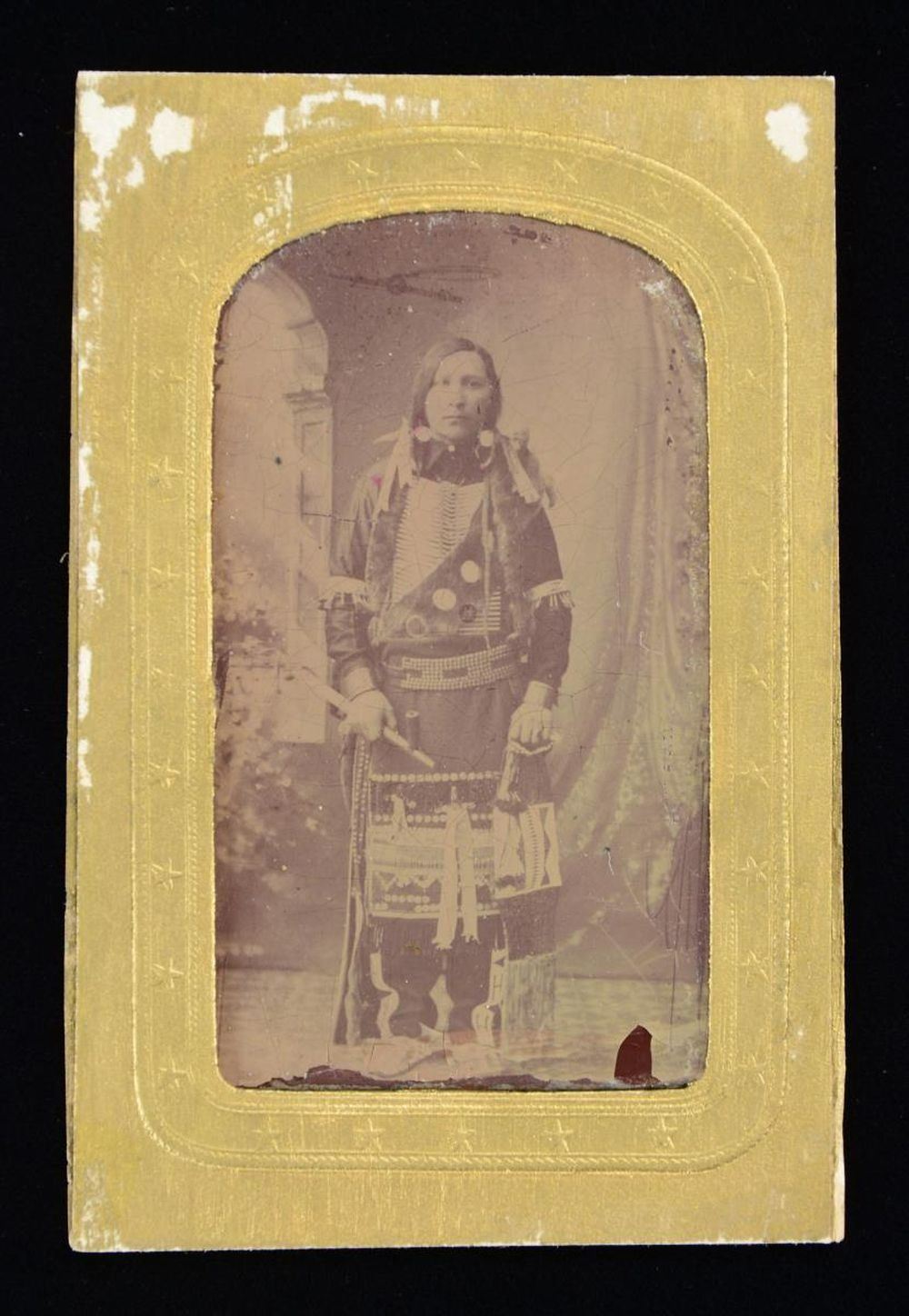 A CDV sized tintype in a patriotic paperboard mat. The image depicts a Native American male in full Native clothing featuring numerous beaded items. He holds a pipe bag in his left hand and a catlinite pipe in his right hand. He wears a bone breastplate along with a belt & shoulder sash. He has 2 wrist cuffs and a large bag in front of him. Even his moccasins are visible. CONDITION: the image is slightly dark but exceptionally well detailed. There is a slight loss of emulsion near the bottom that does not affect the image. Some craquelure is visible. (02-20978/BF). $500-700.