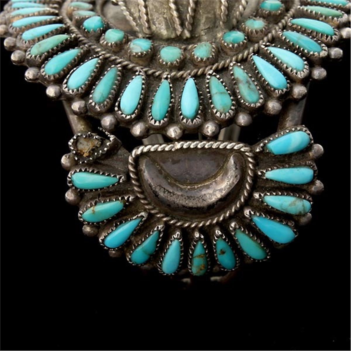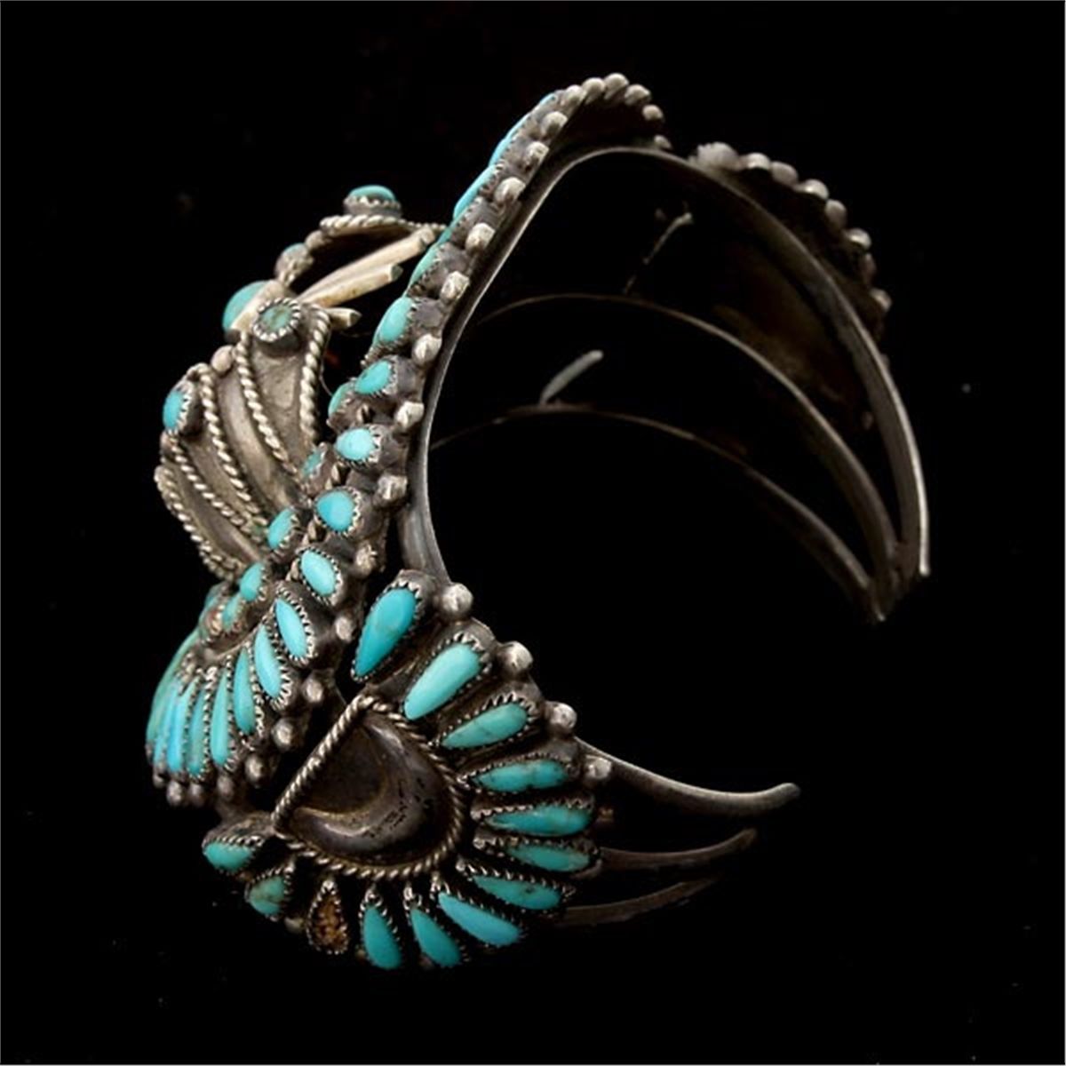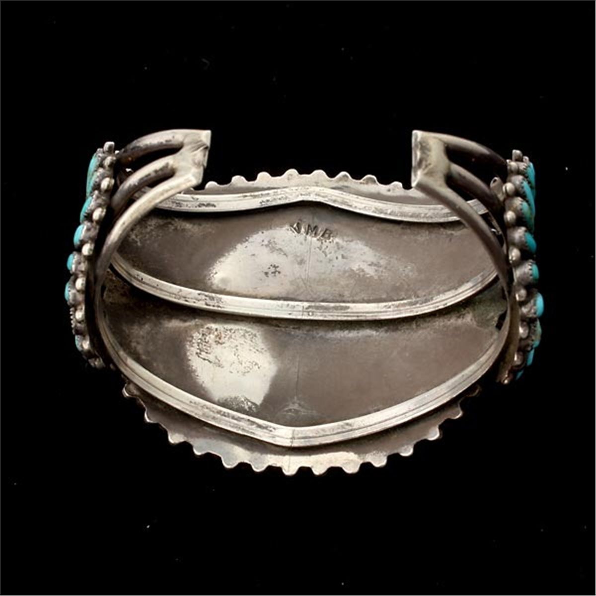 NATIVE AMERICAN TURQUOISE, SILVER BRACELET. Featuring numerous varying shaped turquoise cabochons, collette set in a silver cuff mounting. 44.4 dwts Note: Two stones missing.