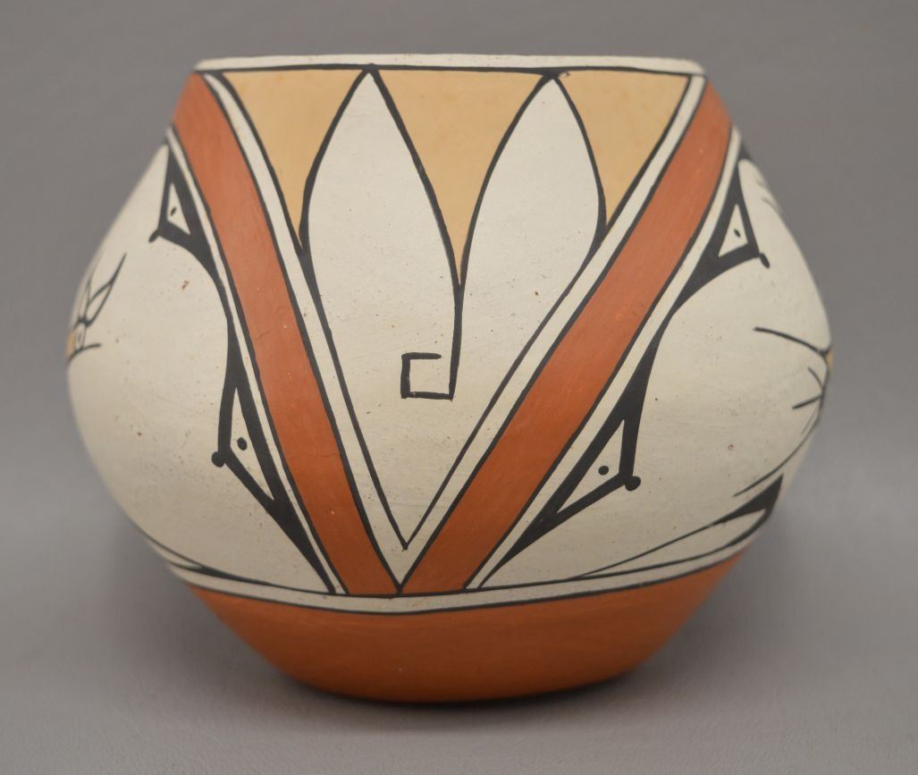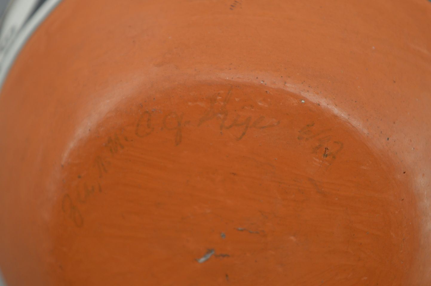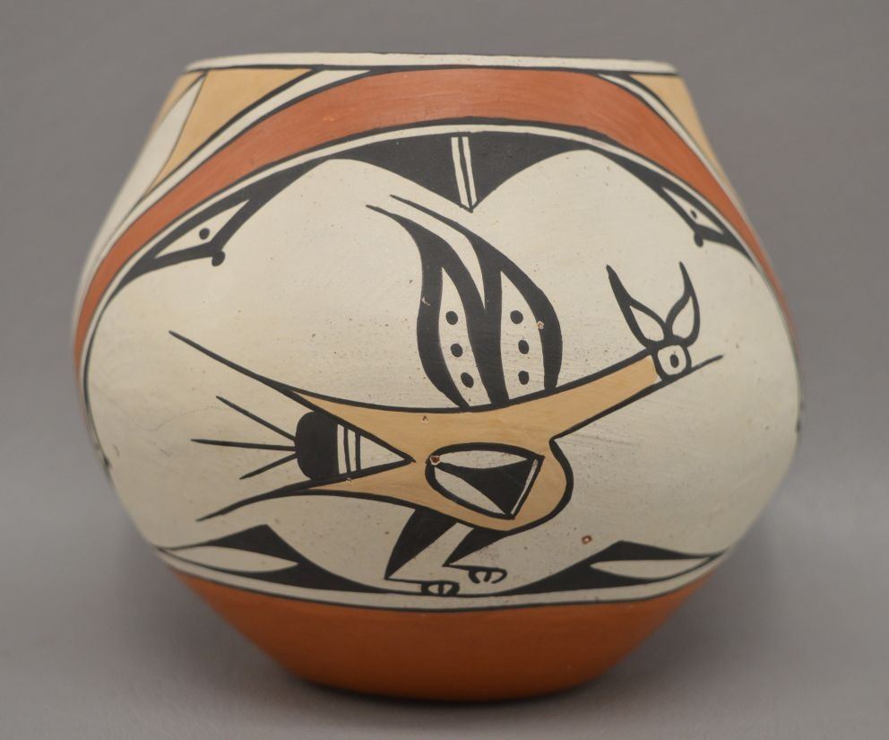 1992 zia indian hand coiled with four color painted geometric and bird design signed C.G Shije 5" x 4"