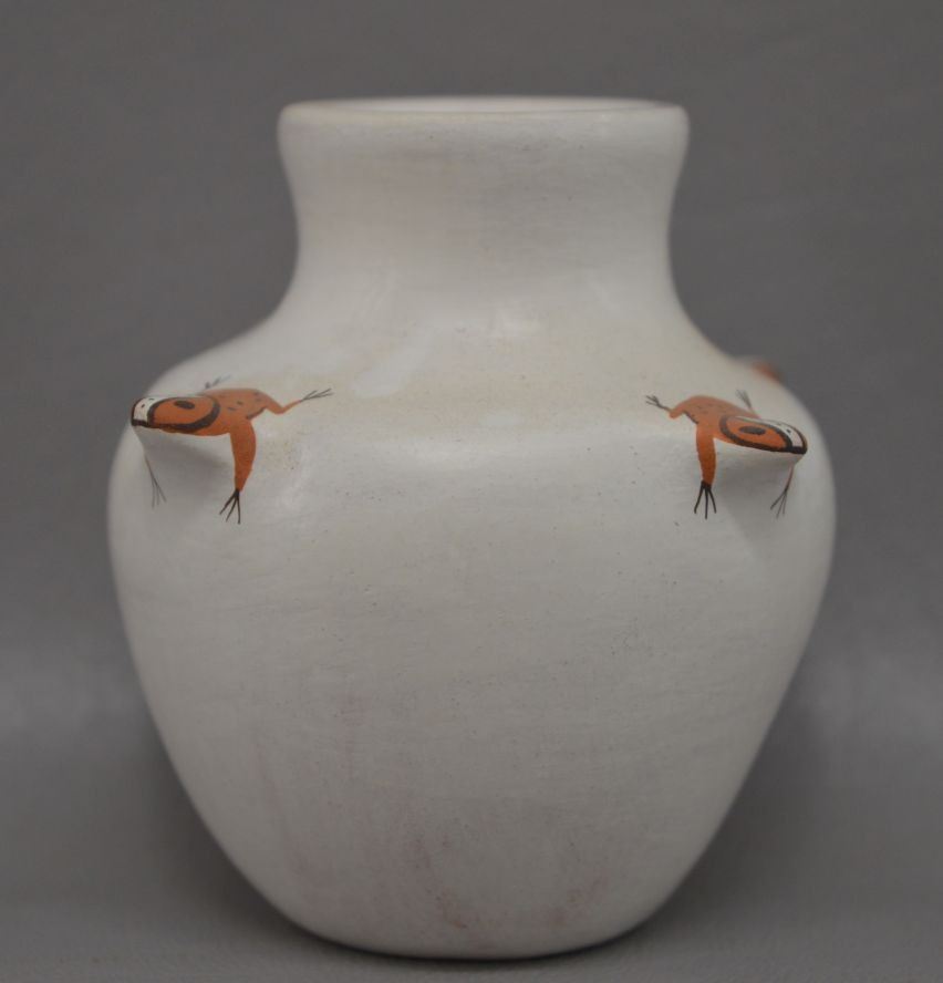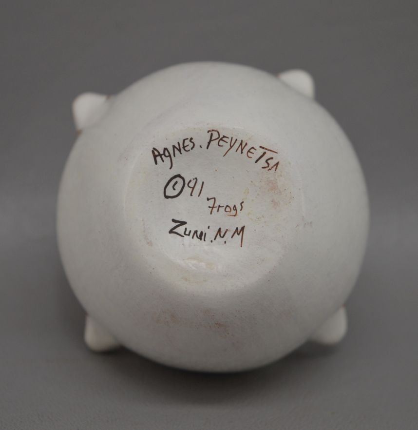 1991 zuni indian hand coiled and painted with raised frog design signed Agnes Peynetsa 3" x 2.75"