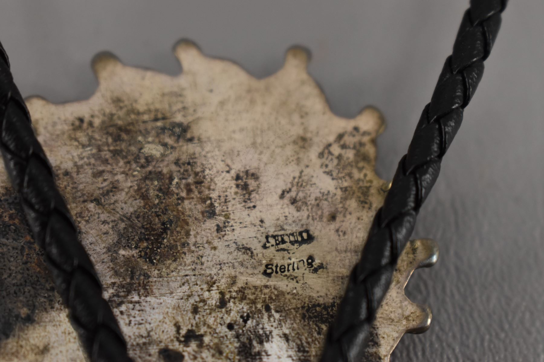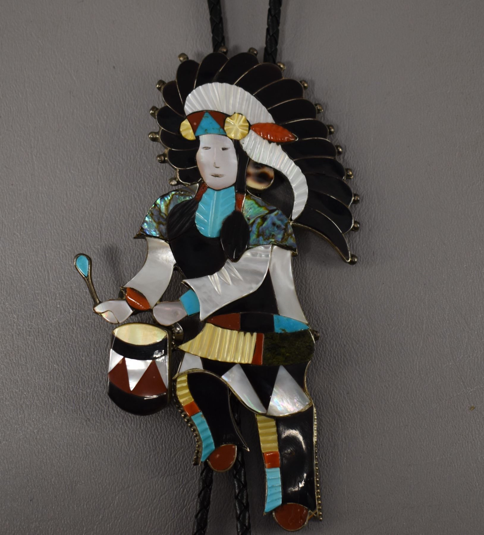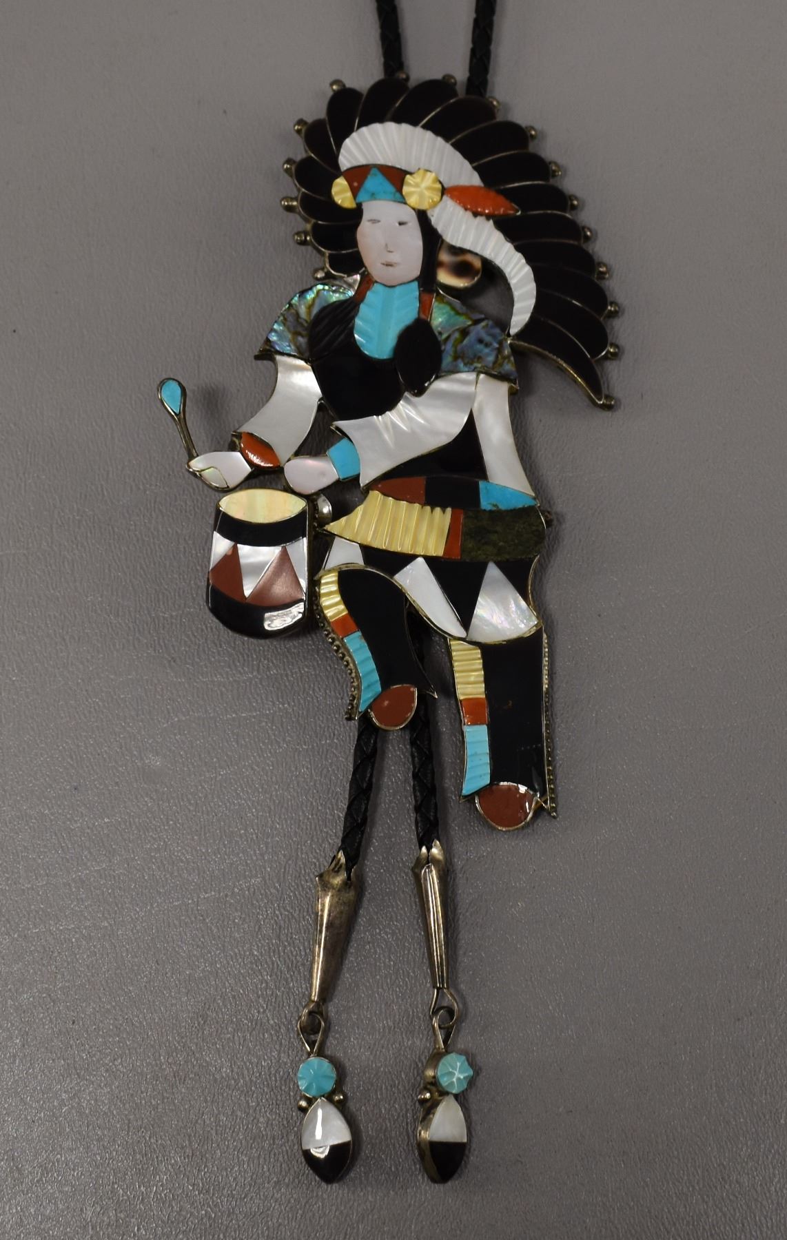 1980-90's Zuni Indian hand made sterling silver with inlaid shell turquoise coral signed J Beyuka 5.75" x 3"