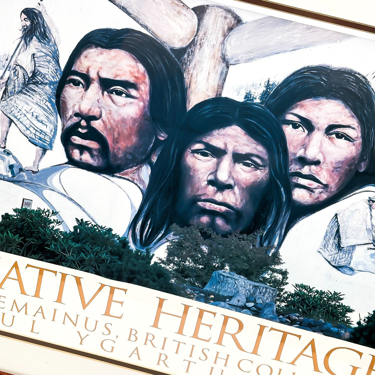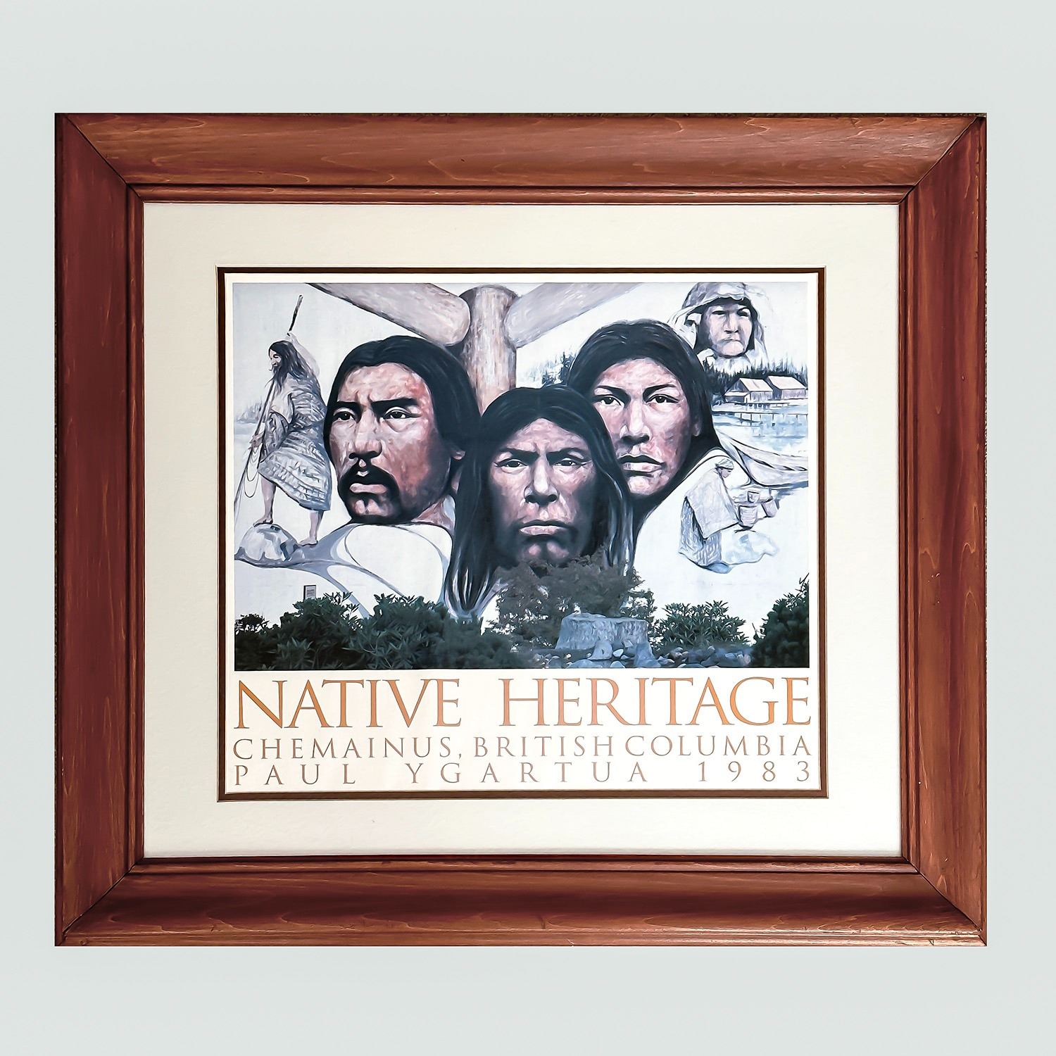 #8016 - WOOD FRAMED AND UNDER GLASS. LARGE FRAMED PRINT OF NATIVE HERITAGE MURAL IN CHEMAINUS, COWICHAN VALLEY, VANCOUVER ISLAND, BRITISH COLUMBIA, CANADA. FRAME MEASURES: 29” (74 CM) LONG BY 25” (63.5 CM) HIGH. PRINT AREA MEASURES:23.25” (59 CM) WI***ITEM(S) LOCATED IN LETHBRIDGE ALBERTA. FREE TRANSPORT TO EDMONTON OFFICE AVAILABLE FOR THIS AUCTION. WORLDWIDE SHIPPING IS AVAILABLE FOR ALL ITEMS
