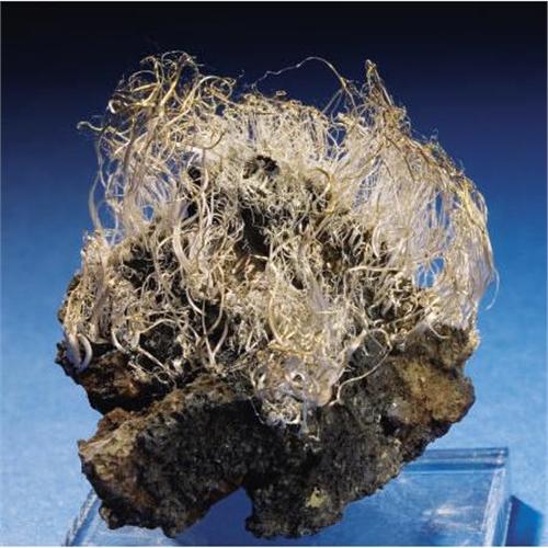<B>NATIVE WIRE SILVER ON MATRIX</B></I><BR> <I>Imiter Mine, Boumalne-Dadès, Ouarzazate Province, Souss-Massa-Draâ Region, Morocco</B></I><BR>Native silver in any form is rare but wire silvers are even more so. This superb specimen of crystallized wire silver from the recent finds in Morocco (mined in 2006) has hundreds of shimmering native silver wires erupting like flames from a brown-black acanthite matrix. Acanthite is a silver sulfide - thus you have silver wires growing out of a silver mineral. It is unusual to find silver wire specimens preserved on matrix with such an aesthetic presentation. This extremely fine specimen measures 2 inches wide x 2 3/8 inches high and is 1 ¾ inches deep. The silver wires themselves are estimated to be from 1 inch to over 1 ½ inches in length.<BR><BR><b>Shipping:</b> Requires 3rd Party Shipping (<a target="_blank" href="http://www.heritageauctions.com/common/shipping.php">view shipping information</a>)