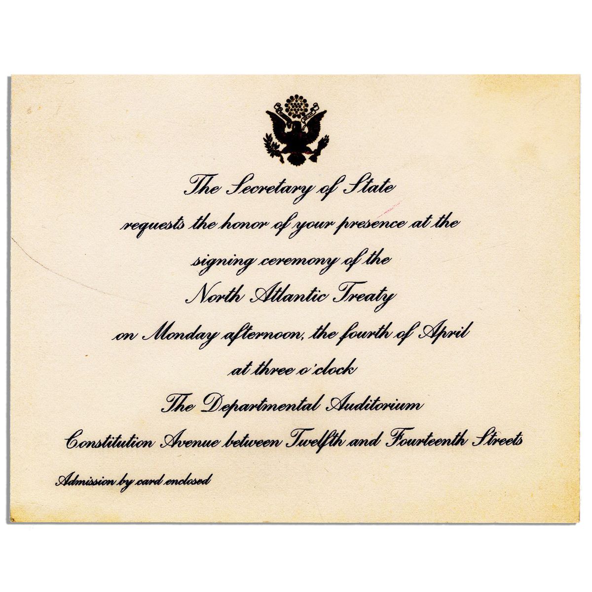 Rare invitation to attend the signing of the North Atlantic Treaty on 4 April 1949, originally binding 12 countries together in their collective defense. Since then, NATO has expanded to 28 countries and is a fundamental construct of U.S. foreign policy. Formal invitation from the Secretary of State features a gold embossed Great Seal of the United States. Card measures 5.75'' x 4.5''. Stray pencil mark, otherwise fine condition.