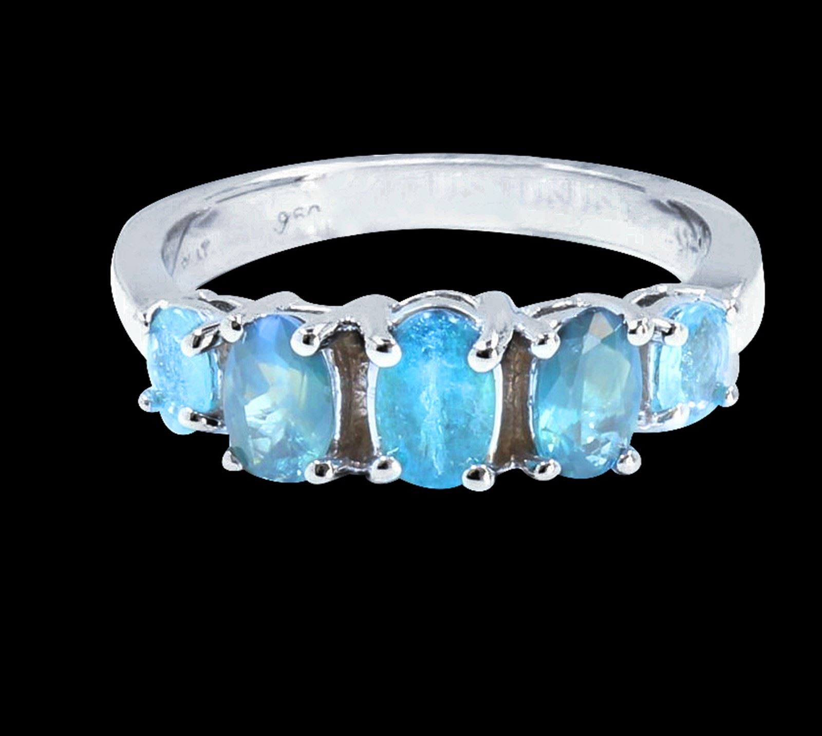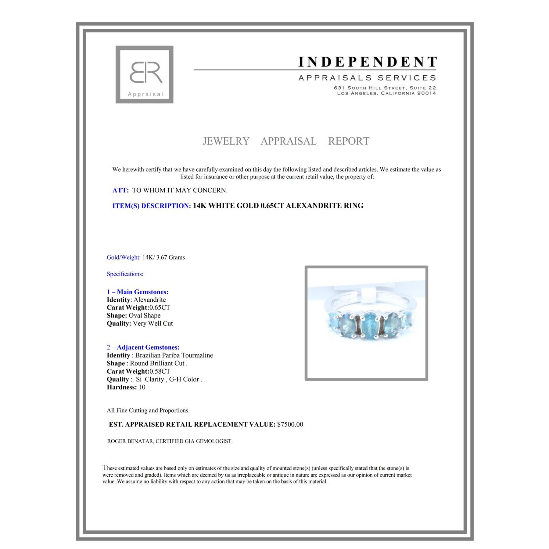 14K W/G NATURAL PARAIBA TOURMALINE AND NATURAL ALEXANDRITE RING :3.67GRAM /BRAZIL PARAIBA: 0.58CT / ALEXANDRITE :0.65CT/#GVR1307 **Delicately crafted in 14k white gold, this elegant display of sparkling 0.65 carat oval shape Alexandrite are enhanced with shimmering 0.58 carat round brilliant cut Brazilian Pariba Tourmaline, creating a glittering band of timeless beauty. Using Alexandrite in meditation, stone layouts or in jewlrey can stimulate a harmonic opening of the heart chakra, third eye and crown chakras. **