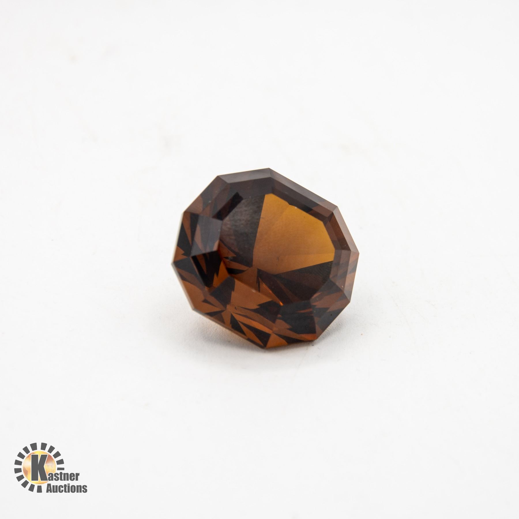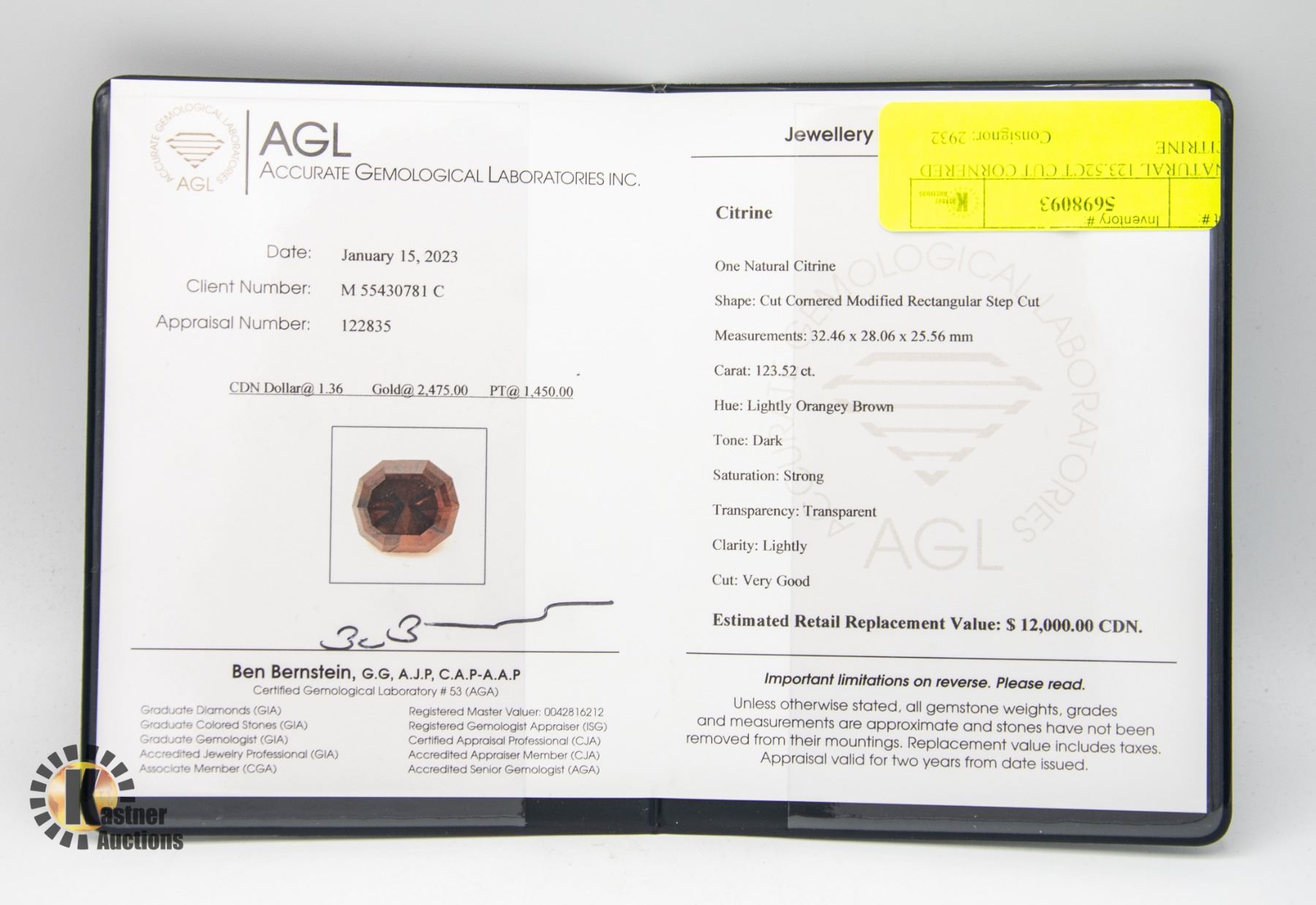 MODIFIED RECTANGULAR STEP CUT CITRINE MEASURING 32.46 X 28.06 X 25.56MM, HUE IS LIGHTLY ORANGE-BROWN, TONE IS DARK, SATURATION IS STRONG. TRANSPARENT STONE IS LIGHTLY INCLUDED WITH VERY GOOD CUT. COMES WITH APPRAISAL FROM AGL (122835) WITH APPRAISED VALUE $12,000.00 **ALL ITEMS MUST BE REMOVED BY 5PM SATURDAY, OCTOBER 14TH 2023. ALL REMAINING ITEMS WILL BE SUBJECT TO A $6.00 PER DAY STORAGE CHARGE. ANY ITEMS REMAINING AFTER MONDAY, OCTOBER 30TH, 2023 WILL BE CONSIDERED FORFEITED. NO REFUNDS WILL BE ISSUED FOR FORFEITED ITEMS. TO SCHEDULE A PICK UP APPOINTMENT CLICK HERE