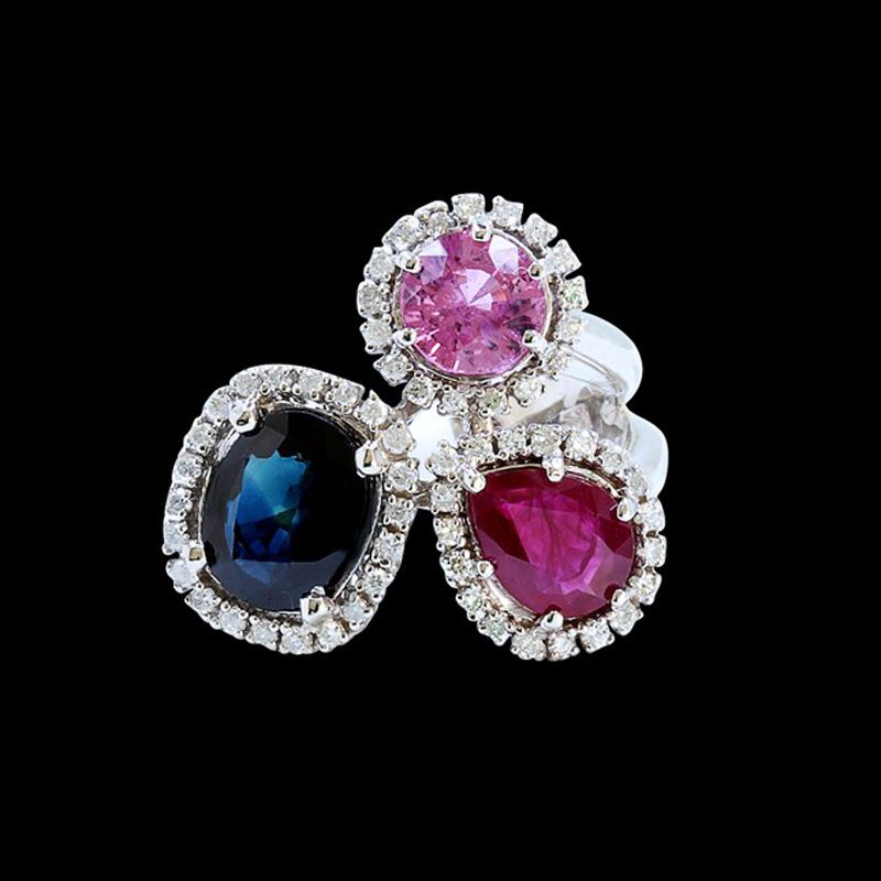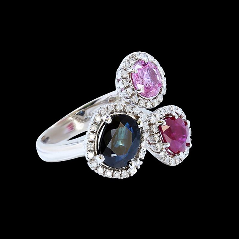 14k W/G NATURAL CEYLON PINK SAPPHIRE & RUBY RING: 7.70GR /NATURAL PINK SAPPHIRE :1.44CT/NATURAL BLUE SAPPHIRE :2.29CT/ DIAMOND :0.58CT/NATURAL RUBY NO GLASS :1.30CT/#GVR1363/ NO LEAD OR GLASS FILLING