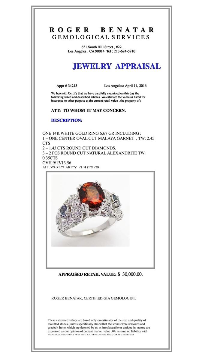 14K WHITE GOLD NATURAL ALEXANDRITE VERY GOOD COLOR CHANGE MALAYA GARNET RING:6.67 GRAMS/DIAMOND:1.43CT/ALEXANDRITE:0.35CT/MALAYA GARNET:2.45CT/#GVR1032/MALAYA GARNET IS THE VERY RARE GARNET IN THE GARNET FAMILY. VERY HARD TO FIND THIS KIND OF COLOR AND QULAITY