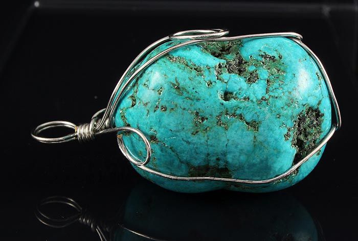 NATURAL 255.33CTW TURQUOISE WIRE WRAPPED PENDANT **|**|** TURQUOISE PENDANT IN MODERN DESIGN GEMSTONE SILVER WIRE WRAPPED JEWELRY MEASURING 1.61X1.35 INCHES ; MSRP: $300