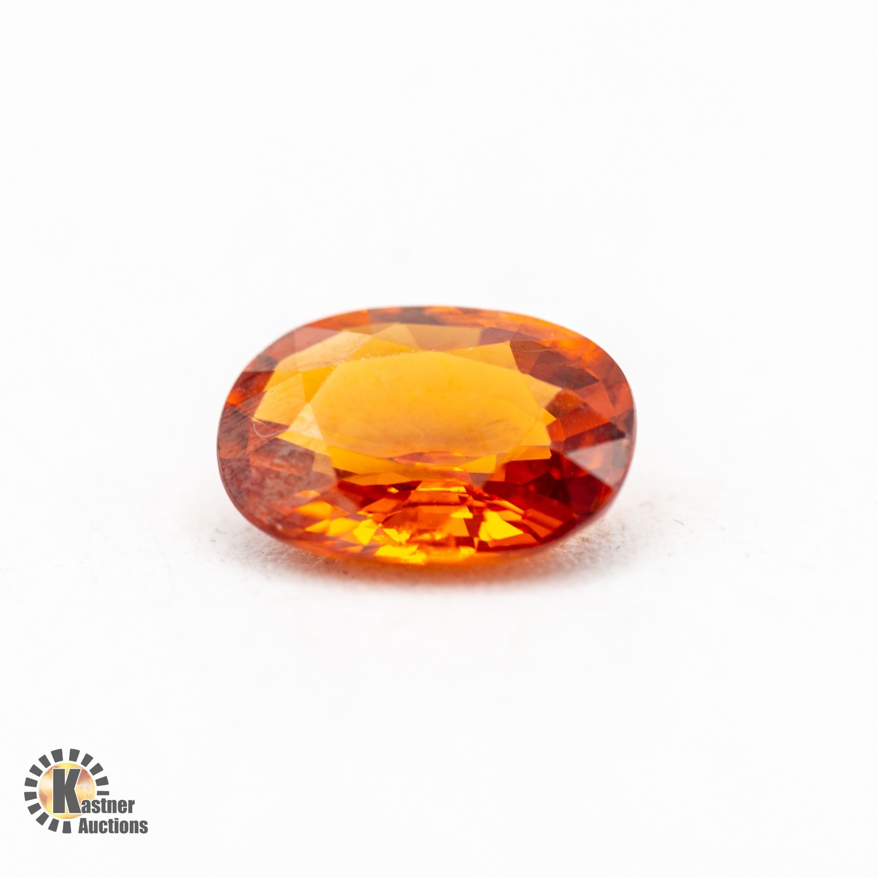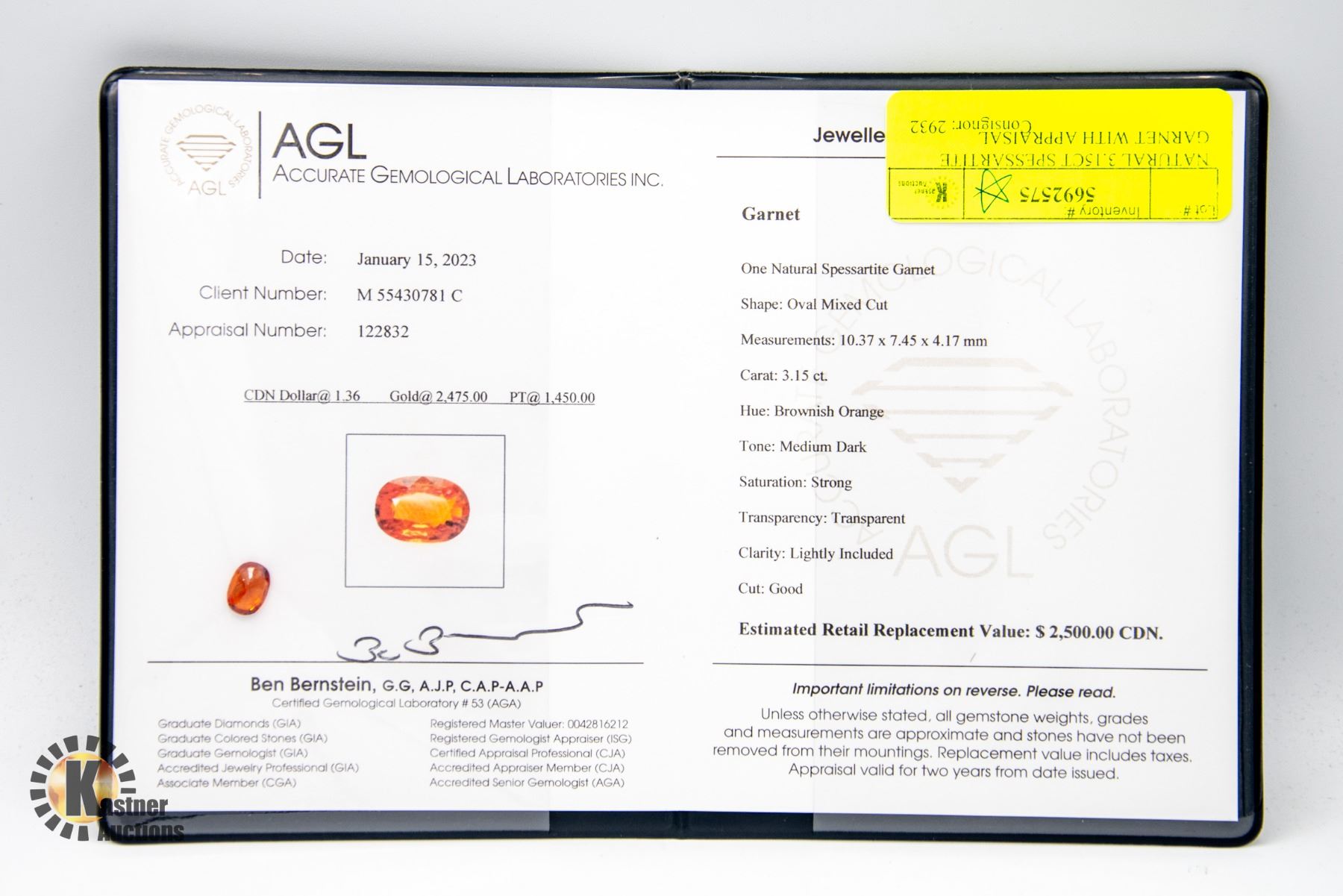 OVAL MIXED CUT SPESSARTITE GARNET MEASURING 10.37 X 7.45 X 4.17MM, HUE IS BROWNISH ORANGE, TONE IS MEDIUM DARK, SATURATION IS STRONG. THIS TRANSPARENT GEM IS LIGHTLY INCLUDED, WITH A GOOD CUT. COMES WITH APPRAISAL FROM AGL (122832) AND IS APPRAISED AT $2,500.00 **ALL ITEMS MUST BE REMOVED BY 5PM SATURDAY, SEPTEMBER 9TH 2023. ALL REMAINING ITEMS WILL BE SUBJECT TO A $6.00 PER DAY STORAGE CHARGE. ANY ITEMS REMAINING AFTER MONDAY, SEPTEMBER 25TH, 2023 WILL BE CONSIDERED FORFEITED. NO REFUNDS WILL BE ISSUED FOR FORFEITED ITEMS. TO SCHEDULE A PICK UP APPOINTMENT CLICK HERE
