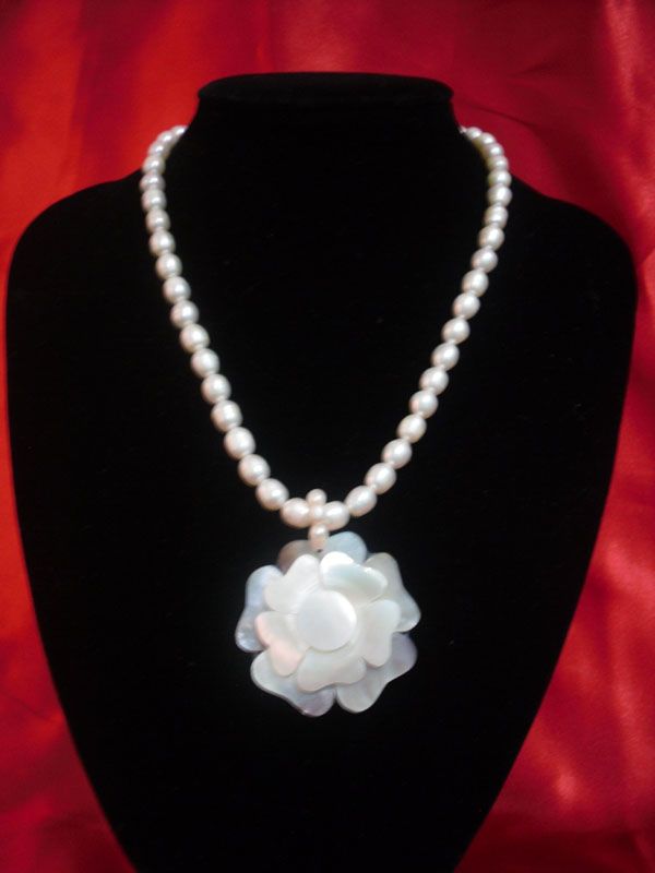 NATURAL 300 CTW WHITE PEARL CAPIZ FLOWER PENDANT **|**|** NATURAL 300 CTW WHITE PEARL CAPIZ FLOWER PENDANT; MAINSTONE PEALS; SIZE 16inc; TOTAL STRANDS 1; TOTAL WEIGHT 300 CTW ; MSRP: $150