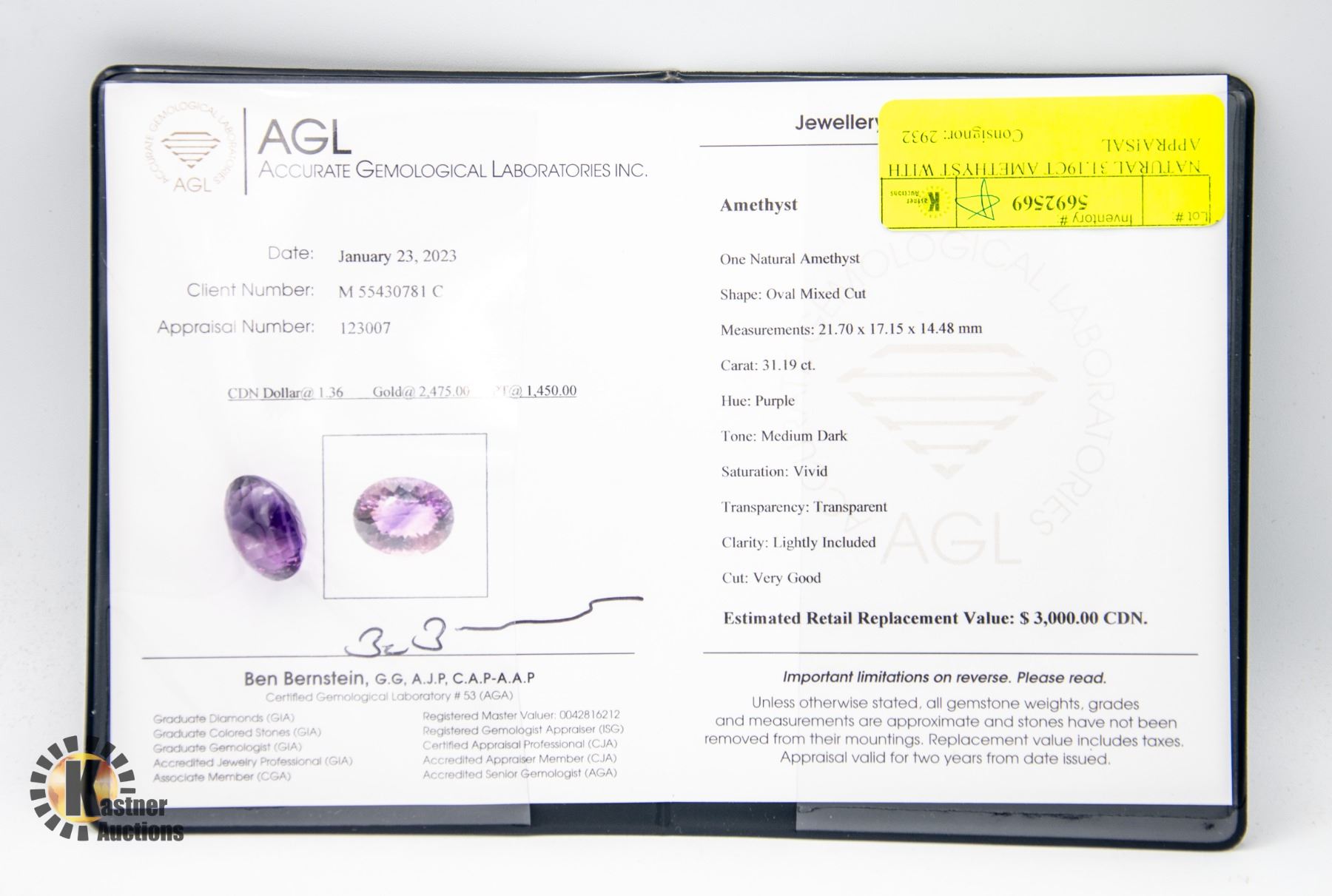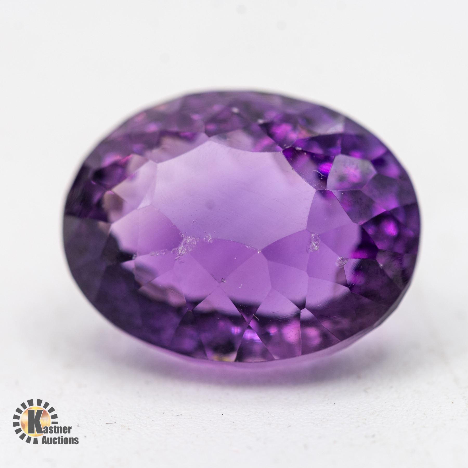 OVAL MIXED CUT AMETHYST MEASURING 21.70 X 17.15 X 14.48MM, HUE IS PURPLE, TONE IS MEDIUM DARK, SATURATION IS VIVID. THIS TRANSPARENT STONE IS LIGHTLY INCLUDED, WITH A VERY GOOD CUT. COMES WITH APPRAISAL FROM AGL (123007) AND IS APPRAISED AT $3,000.00 **ALL ITEMS MUST BE REMOVED BY 5PM SATURDAY, SEPTEMBER 9TH 2023. ALL REMAINING ITEMS WILL BE SUBJECT TO A $6.00 PER DAY STORAGE CHARGE. ANY ITEMS REMAINING AFTER MONDAY, SEPTEMBER 25TH, 2023 WILL BE CONSIDERED FORFEITED. NO REFUNDS WILL BE ISSUED FOR FORFEITED ITEMS. TO SCHEDULE A PICK UP APPOINTMENT CLICK HERE