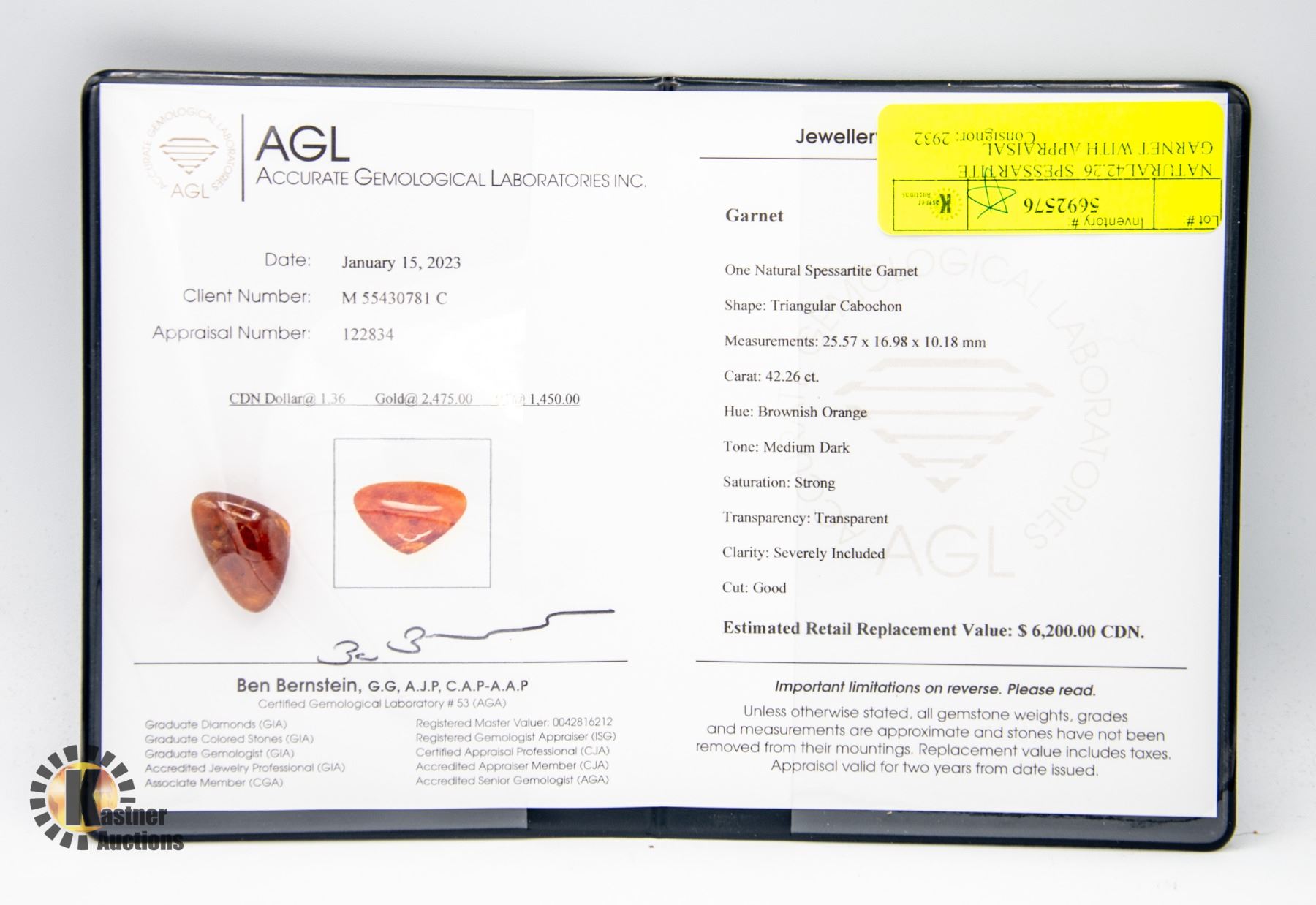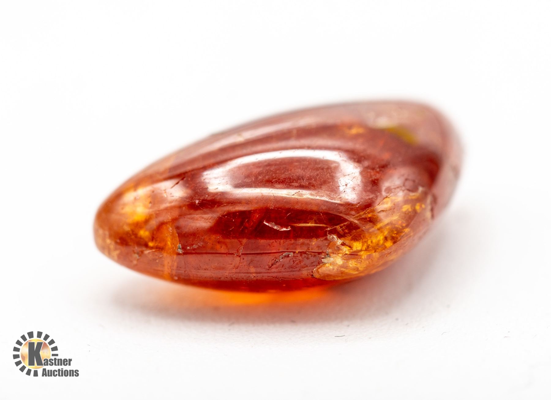 TRIANGULAR CABOCHON MEASURING 25.57 X 16.98 X 10.18MM, HUE IS BROWNISH ORANGE, TONE IS MEDIUM DARK, SATURATION IS STRONG. THIS TRANSPARENT GEM IS SEVERELY INCLUDED, THE CUT IS GOOD. COMES WITH APPRAISAL FROM AGL (122834) WITH AN APPRAISED VALUE OF $6,200.00 **ALL ITEMS MUST BE REMOVED BY 5PM SATURDAY, SEPTEMBER 9TH 2023. ALL REMAINING ITEMS WILL BE SUBJECT TO A $6.00 PER DAY STORAGE CHARGE. ANY ITEMS REMAINING AFTER MONDAY, SEPTEMBER 25TH, 2023 WILL BE CONSIDERED FORFEITED. NO REFUNDS WILL BE ISSUED FOR FORFEITED ITEMS. TO SCHEDULE A PICK UP APPOINTMENT CLICK HERE
