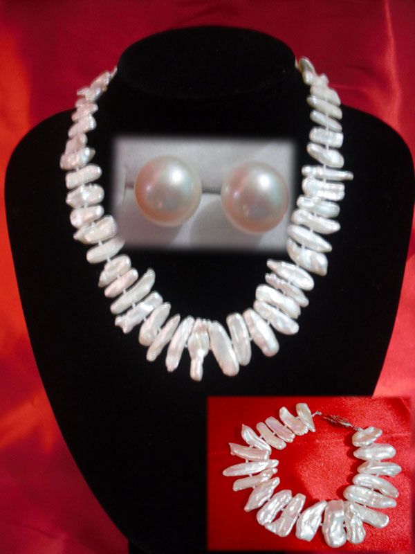 NATURAL 425 CTW KISHI WHITE PEARL TRIBAL DESIGN SET **|**|** NATURAL 425 CTW KISHI WHITE PEARL TRIBAL DESIGN SET; MAINSTONE WHITE KISHI PEARL ; NECKLACE SIZE 16inc; BRACELET SIZE 8in; TOTAL WEIGHT 325 CTW; LOCK CLASP LOCK; WHITE STUD EARRINGS ; MSRP: $285