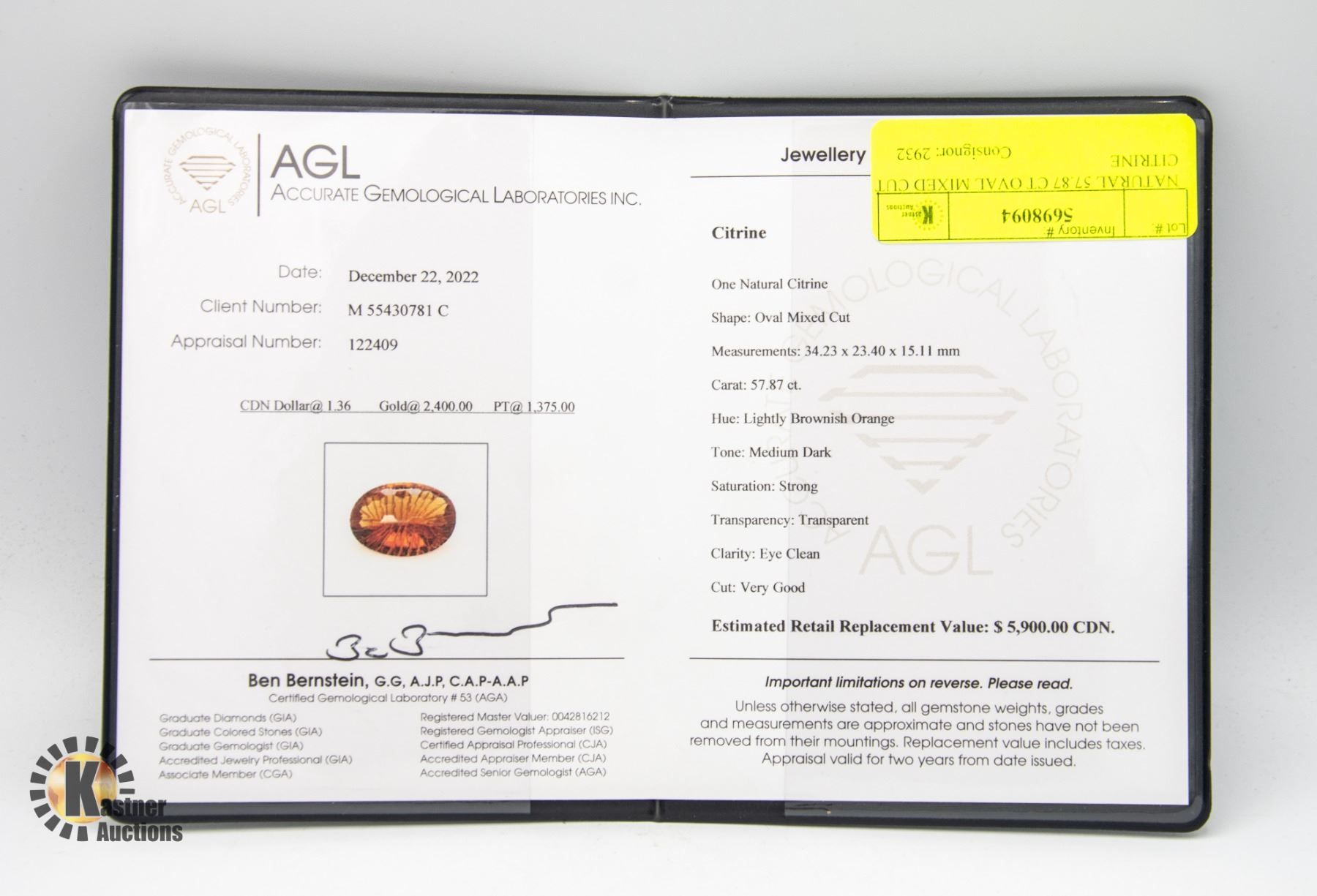 MEASURING 34.23 X 23.40 X 15.11MM, HUE IS LIGHTLY BROWNISH ORANGE, TONE IS MEDIUM DARK, SATURATION IS STRONG. TRANSPARENT STONE WITH EYE CLEAN CLARITY AND VERY GOOD CUT. COMES WITH APPRAISAL FROM AGL (122409) WITH APPRAISED VALUE $5,900.00 **ALL ITEMS MUST BE REMOVED BY 5PM SATURDAY, OCTOBER 14TH 2023. ALL REMAINING ITEMS WILL BE SUBJECT TO A $6.00 PER DAY STORAGE CHARGE. ANY ITEMS REMAINING AFTER MONDAY, OCTOBER 30TH, 2023 WILL BE CONSIDERED FORFEITED. NO REFUNDS WILL BE ISSUED FOR FORFEITED ITEMS. TO SCHEDULE A PICK UP APPOINTMENT CLICK HERE