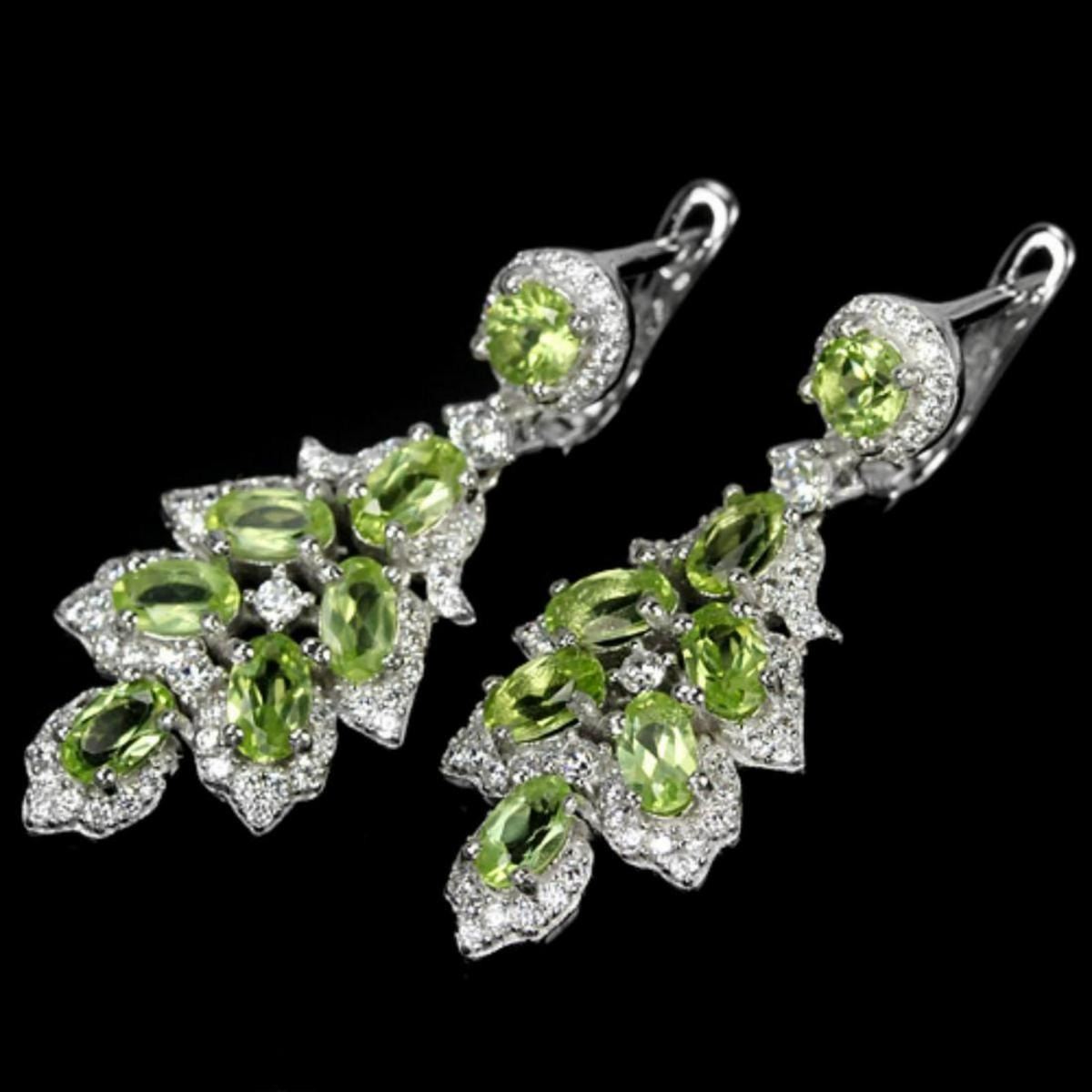 NATURAL GREEN PERIDOT OVAL & WHITE CZ 925 SILVER EARRING 14K WHITE GOLD COATING;STONE SHAPEOVAL PORTUGUESE CUTSTONE DIMENSION5 X 3 MM.ITEM WEIGHT6.7 GRAMCOLORGREENCLARITYVVS - VSLUSTERDAZZLINGTREATMENTUNHEATEDORIGIN OF STONEASIAHARDNESS6.5;FACE OF EARRING 32 X 12 MM. WHITE CUBIC ZIRCONIA 1 MM. & 1.7 MM.