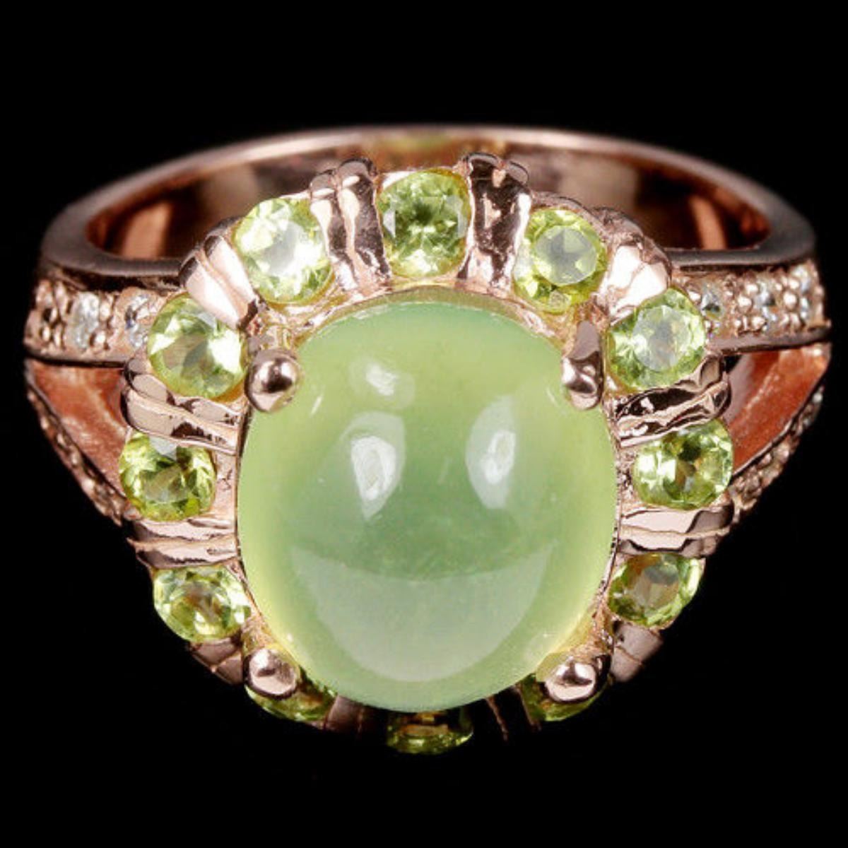 NATURAL AAA GREEN PREHNITE PERIDOT & CZ 925 SILVER RING 14K PINK GOLD COATING;RING SIZE 6.50 ( can be resized )ITEM QUANTITY1STONE SHAPEOVAL CABOCHON CUTSTONE DIMENSION10.2 X 9 X 6.4 MM.ITEM WEIGHT5.9 GRAMCOLORGREENCLARITYTRANSLUCENTLUSTERALLURINGTREATMENTUNHEATED;ORIGIN OF STONEAUSTRALIA;HARDNESS6.0 - 6.5OTHERFACE OF RING 20 X 15 MM. PERIDOT 2.5 MM. WHITE CUBIC ZIRCONIA 1.5 MM.