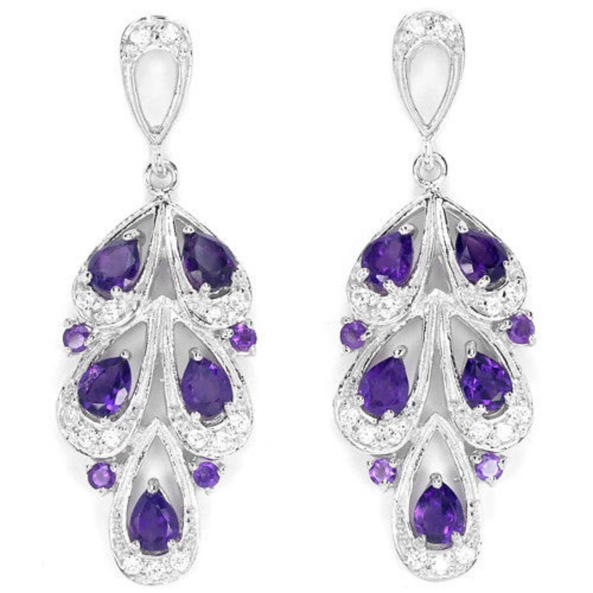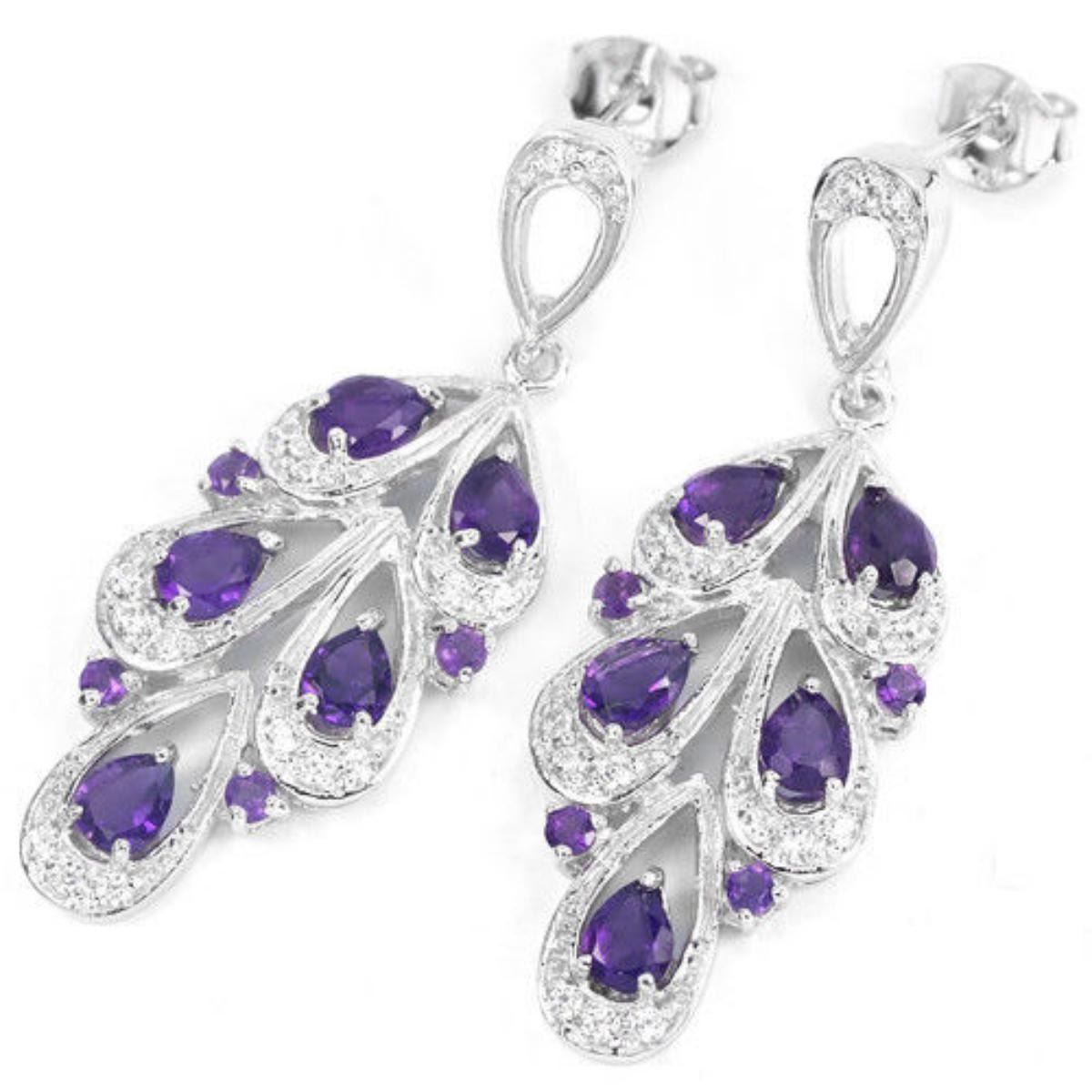 NATURAL PURPLE AMETHYST WHITE CZ 925 SILVER EARRING 14K WHITE GOLD COATING;STONE SHAPE PEAR ROUND PORTUGUESE CUT STONE DIMENSION 5 X 4 MM. 2.2 MM. ITEM WEIGHT 9.2 GRAM COLOR PURPLE CLARITY IF - VVS LUSTER ENCHANTING TREATMENT UNHEATED ORIGIN OF STONE BOLIVIA HARDNESS 7.0 ; FACE OF EARRING 44 X 15 MM. WHITE CUBIC ZIRCONIA 1.5 MM.