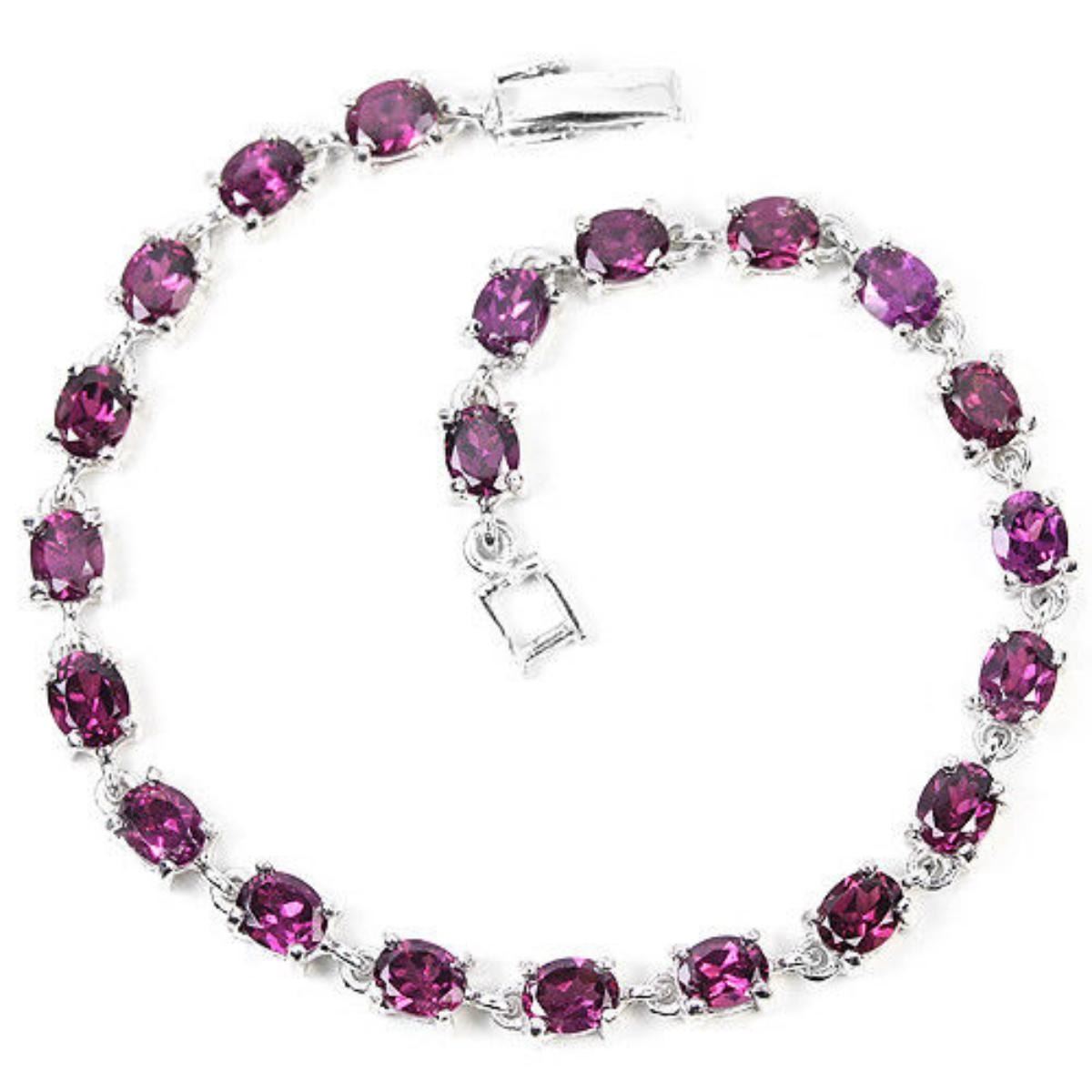 NATURAL PURPLE PINK RHODOLITE GARNET 925 SILVER BRACELET 14K WHITE GOLD COATING; LENGTH OF ITEM (Inch.)7.25 ITEM ; STONE SHAPE OVAL PORTUGUESE CUT STONE DIMENSION 5 X 4 MM.ITEM WEIGHT 9.4 GRAM COLOR PURPLE PINK; CLARITYIF TO VVS LUSTER ENCHANTING TREATMENT NATURAL UNHEATED ORIGIN OF STONE AFRICA HARDNESS 7.5