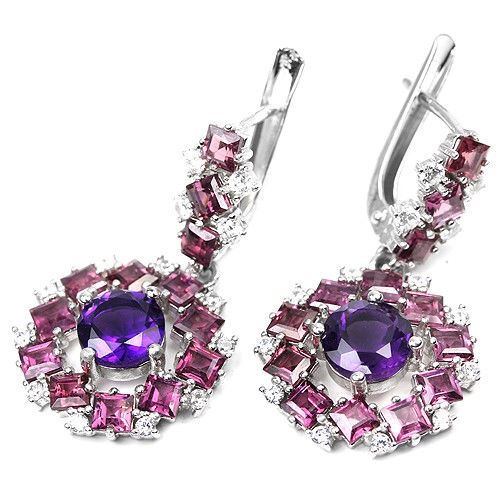 PURPLE AMETHYST, RHODOLITE GARNET CZ 925 SILVER EARRING 14K WHITE GOLD COATING; STONE SHAPE ROUND PORTUGUESE CUT SQUARE FACET CUT STONE DIMENSION 7 MM. , 3 X 3 MM. ITEM WEIGHT 6.92 GRAM COLOR PURPLE PURPLE PINK CLARITY IF TO VVS LUSTER ENCHANTING TREATMENT NATURAL UNHEATED ORIGIN OF STONE BRAZIL AFRICA HARDNESS 7 - 7.5 FACE OF EARRING 32 X 17 MM. WHITE CUBIC ZIRCONIA 1.2 MM.