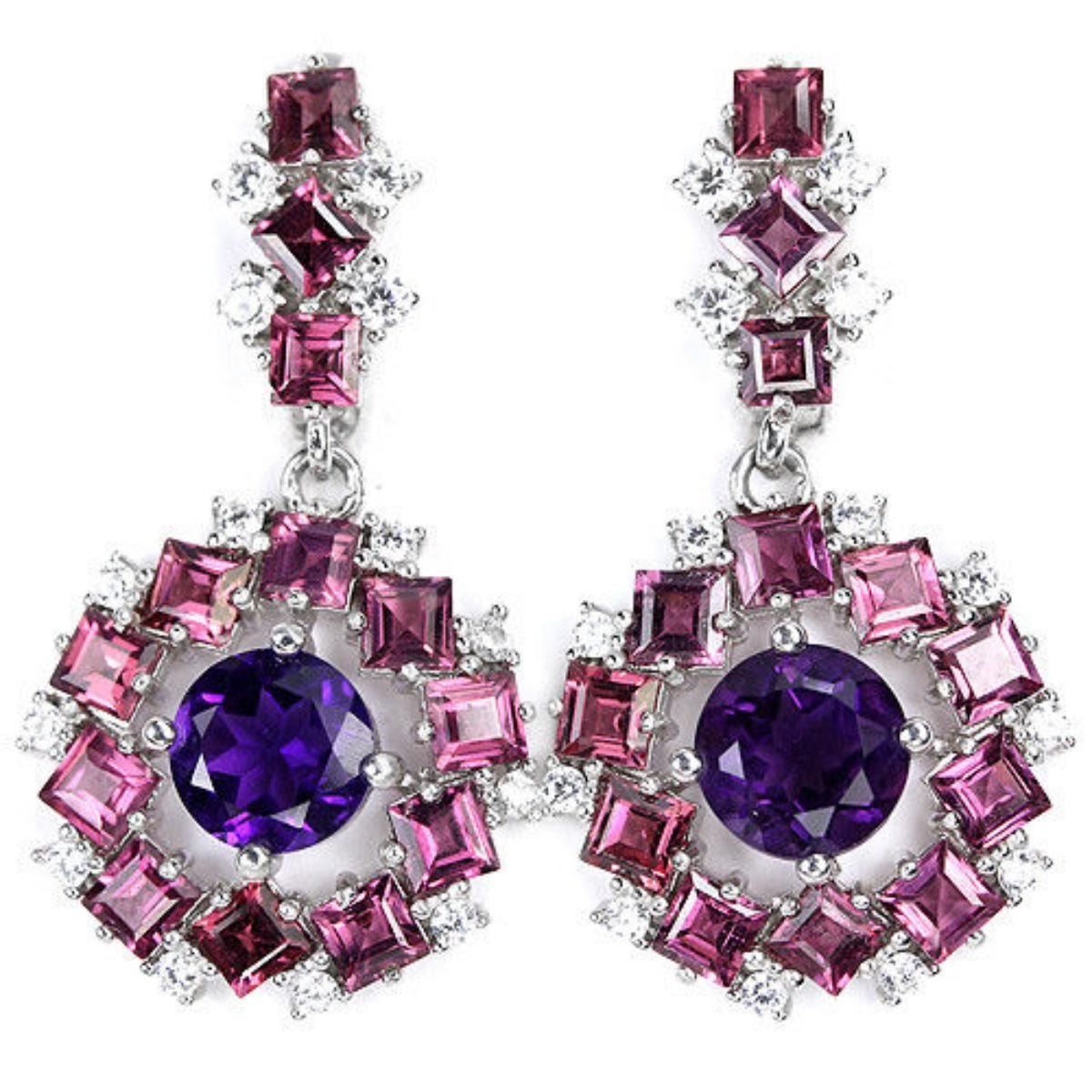PURPLE AMETHYST, RHODOLITE GARNET CZ 925 SILVER EARRING 14K WHITE GOLD COATING; STONE SHAPE ROUND PORTUGUESE CUT SQUARE FACET CUT STONE DIMENSION 7 MM. , 3 X 3 MM. ITEM WEIGHT 6.92 GRAM COLOR PURPLE PURPLE PINK CLARITY IF TO VVS LUSTER ENCHANTING TREATMENT NATURAL UNHEATED ORIGIN OF STONE BRAZIL AFRICA HARDNESS 7 - 7.5 FACE OF EARRING 32 X 17 MM. WHITE CUBIC ZIRCONIA 1.2 MM.