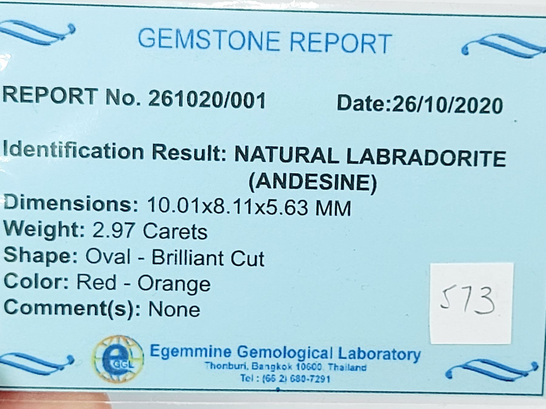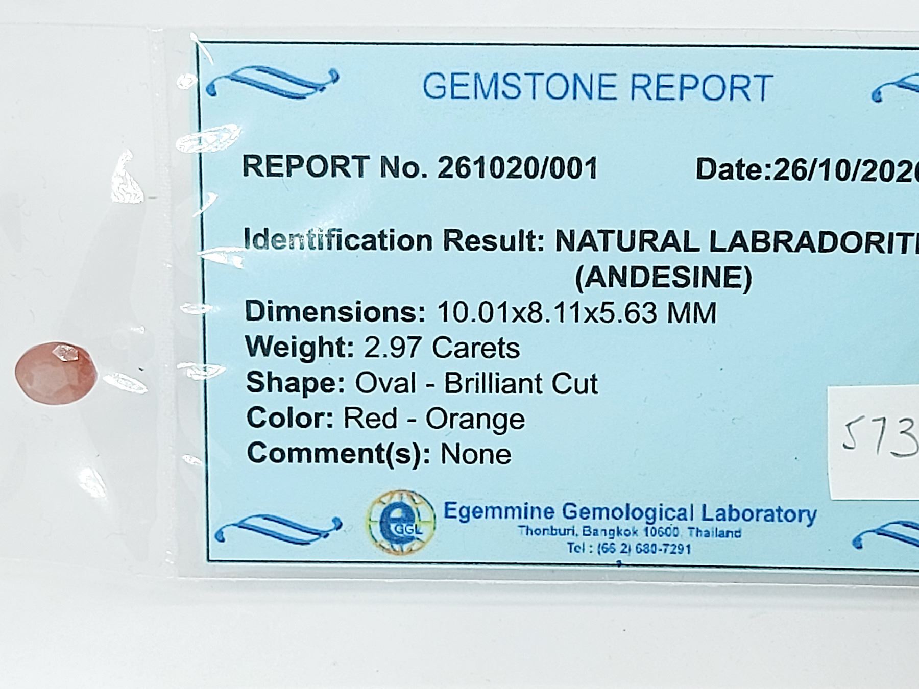 2.97 ct. 10.01 x 8.11 x 5.63 mm. Colour: Red-Orange , Shape: Oval Cut , Clarity: VS , Luster: Excellent Untreated