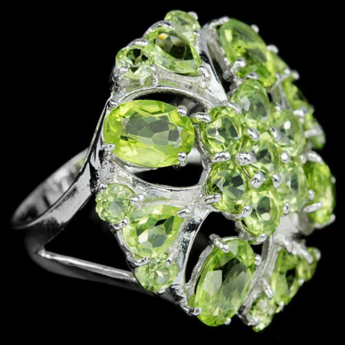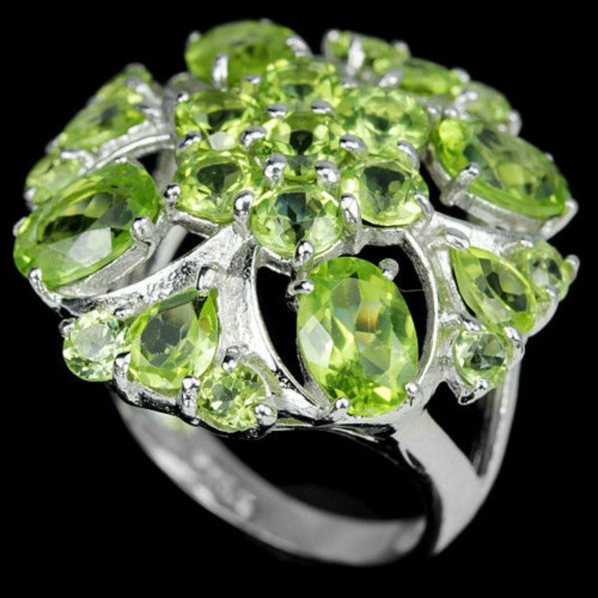 NATURAL APPLE GREEN PERIDOT 925 SILVER FLOWER RING 14K WHITE GOLD COATING; RING SIZE6.75 ( can be resized )ITEM QUANTITY1STONE SHAPEMIXED SHAPESTONE DIMENSION7 X 5 MM. , 5 X 4 MM. , 4 MM. & 3 MM.ITEM WEIGHT6.3 GRAMCOLORAPPLE GREENCLARITYIF - VVSLUSTERDAZZLINGTREATMENTUNHEATEDORIGIN OF STONEASIAHARDNESS6.5;FACE OF RING 25 X 25 MM.