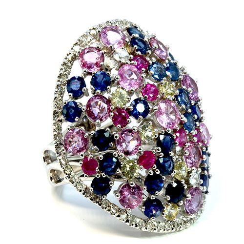 NATURAL CEYLON MIX SAPPHIRE 12.63CT / DIAMOND 0.65CT / 14K WHITE GOLD RING 16.59GRAM