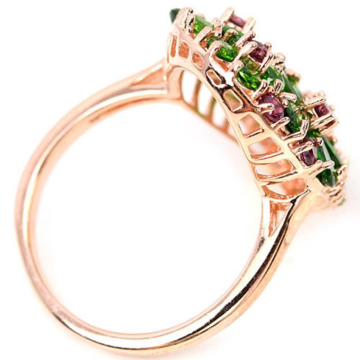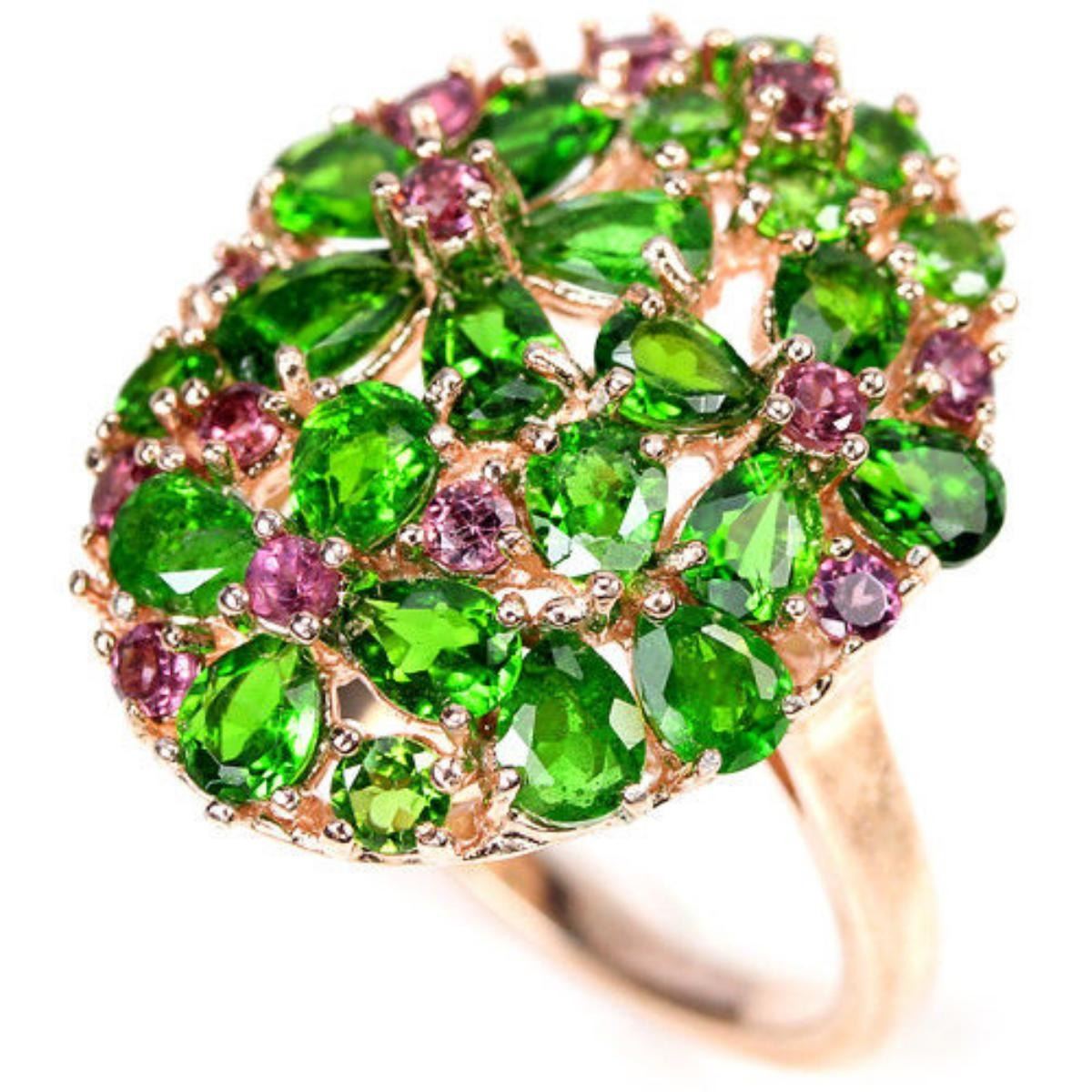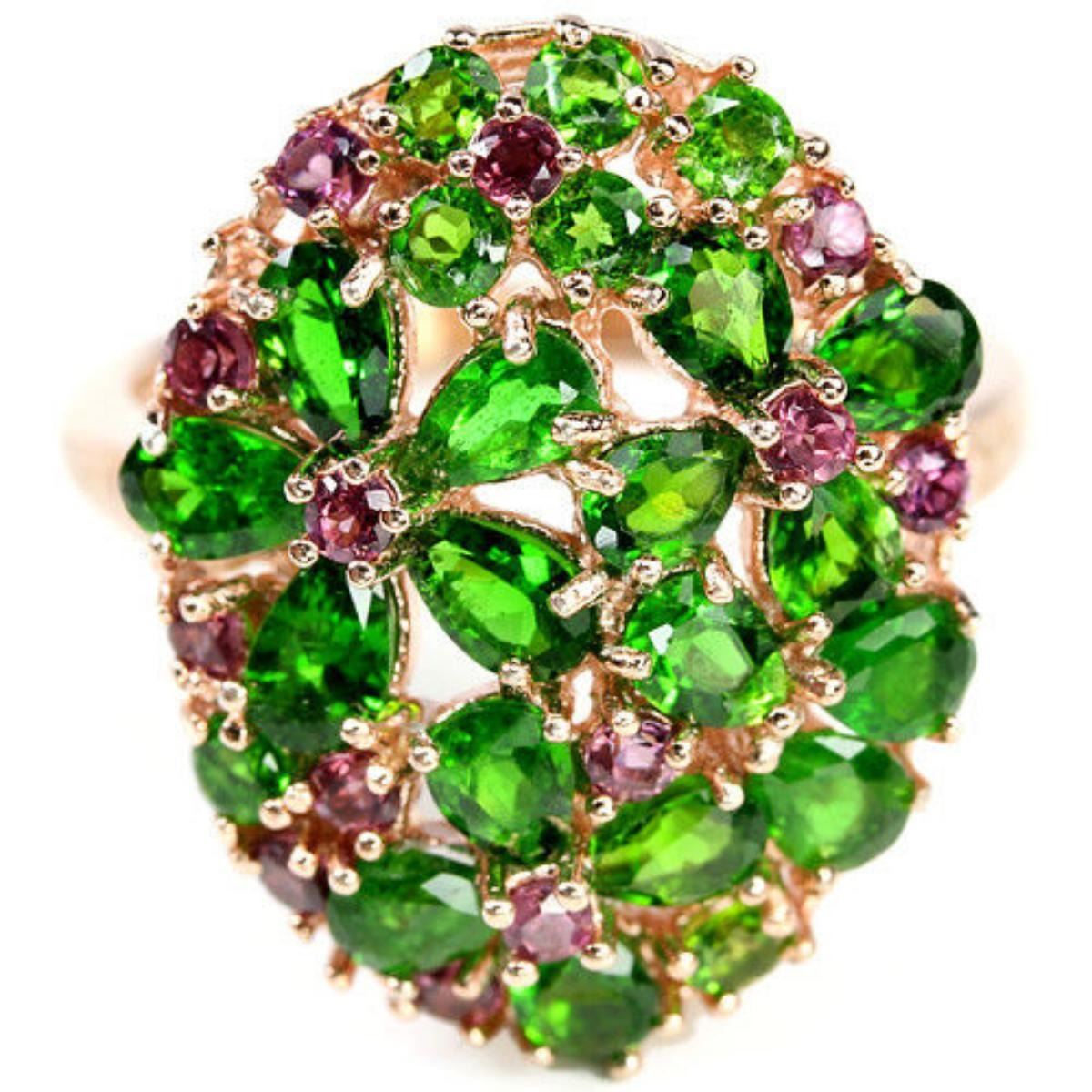 NATURAL CHROME DIOPSIDE RHODOLITE 925 SILVER FLOWER RING 14K PINK GOLD COATING;RING SIZE - 8.75 ( can be resized) ITEM QUANTITY 1 STONE SHAPE PEAR ROUND STONE DIMENSION 5 X 3 MM. , 4 X 3 MM. , 2.5 MM. 2 MM. ITEM WEIGHT 5.47 GRAM COLOR GREEN PURPLISH PINK CLARITY IF VVS TO SI LUSTER EXCELLENT TREATMENT UNHEATED ORIGIN OF STONE AFRICA HARDNESS 7.0 - 7.5 ; FACE OF RING 23 X 19 MM.
