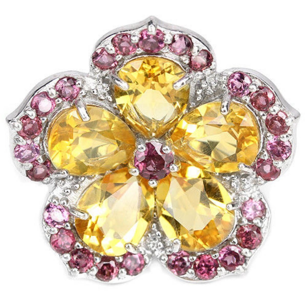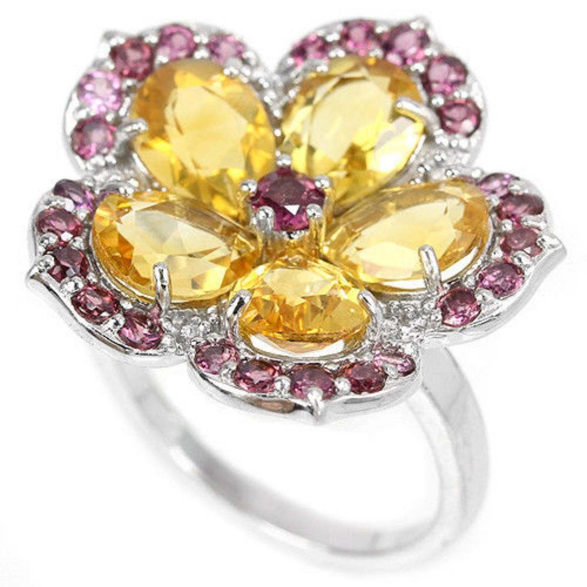 NATURAL YELLOW CITRINE RHODOLITE GARNET 925 SILVER RING 14K WHITE GOLD COATING; RING SIZE - 7.25 can be resized; ITEM QUANTITY -1; STONE SHAPE -PEAR ROUND PORTUGUESE CUT; STONE DIMENSION -8 X 6 MM. , 3 MM. , 2 MM.; ITEM WEIGHT -6.6 GRAM; COLOR -ORANGISH YELLOW PURPLE PINK; CLARITY -IF TO VVS; TREATMENT -NATURAL UNHEATED; ORIGIN OF STONE -BRAZIL AFRICA HARDNESS -7 - 7.5 ; FACE OF RING -23 X 22 MM.