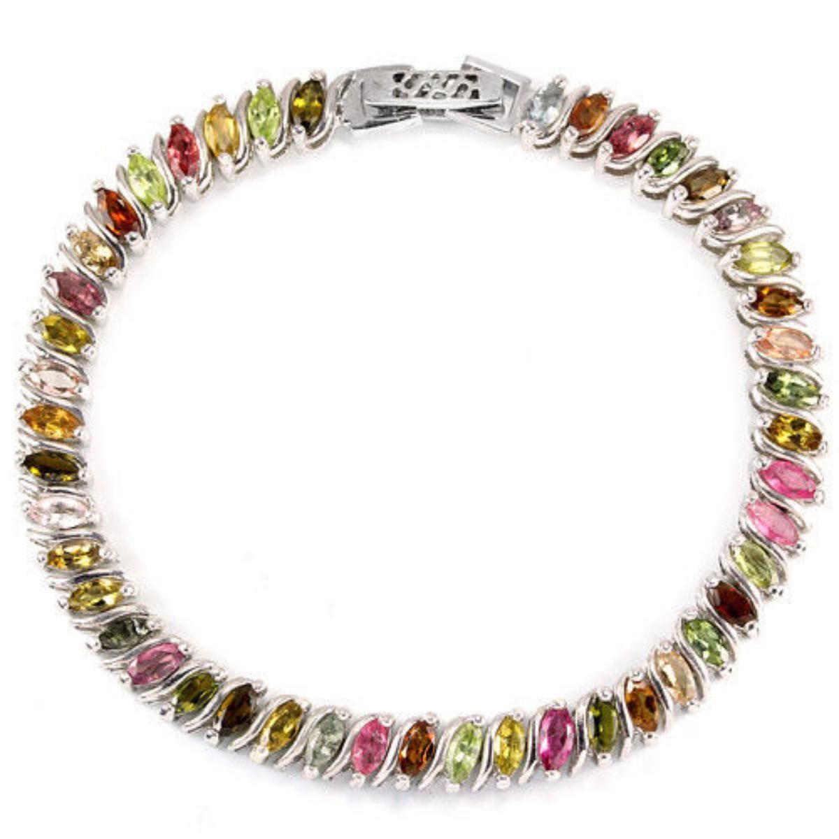 NATURAL MULTI COLOR TOURMALINE 925 SILVER BRACELET 14K WHITE GOLD COATING;LENGTH OF ITEM (Inch.) 7.50 ( RESIZE : NO ) ITEM QUANTITY 1 STONE SHAPE MARQUISE PORTUGUESE CUT STONE DIMENSION 5 X 2.5 MM. ITEM WEIGHT 17.2 GRAM COLOR MULTI COLOR CLARITY VVS, VS - SI LUSTER DELUXE TREATMENT UNHEATED ORIGIN OF STONE AFRICA HARDNESS 7.5