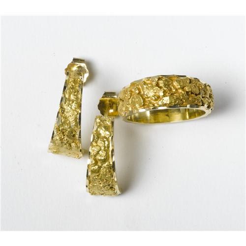 <B>NATURAL GOLD NUGGET, 14K GOLD JEWELRY SUITE</B></I><BR><BR>The suite includes one pair of demi-hoop earrings, designed for pierced ears; together with a matching ring. The suite features natural gold nuggets fused into 14k yellow gold. Ring Size 7. Gross weight for the suite 13.90 grams.<BR><BR> <B>Condition Report:</B> Very good condition.<BR><BR><b>Shipping:</b> Miscellaneous Collectibles, Smal (<a target="_blank" href="http://www.heritageauctions.com/common/shipping.php">view shipping information</a>)