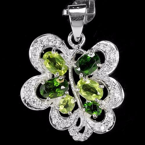 REEN CHROM DIOPSIDE PERIDOT & CZ 925 SILVER PENDANT 14K WHITE GOLD COATING....STONE SHAPEOVAL PORTUGUESE CUTSTONE DIMENSION6 X 4 MM. & 4 X 3 MM.ITEM WEIGHT2.25 CARATCOLORGREENCLARITYVVS - VSLUSTERDAZZLINGTREATMENTUNHEATEDORIGIN OF STONERUSSIA & ASIAHARDNESS5.0 - 6.5OTHERFACE OF PENDANT 29 X 21 MM. WHITE CUBIC ZIRCONIA 1.5 MM. & 1.3 MM. TOTAL 4.30 G.