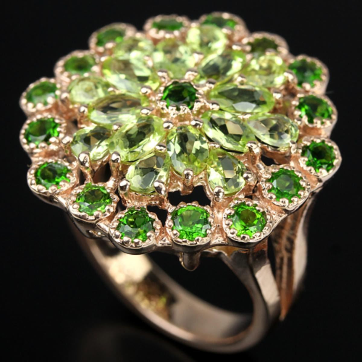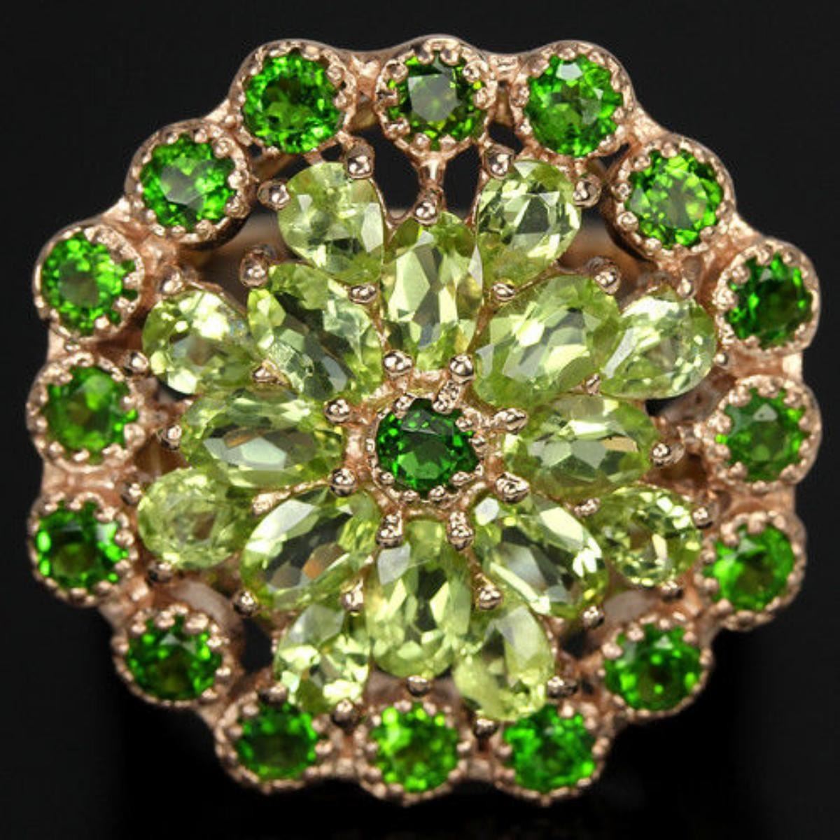 NATURAL GREEN CHROME & APPLE GREEN PERIDOT 925 SILVER RING 14K PINK GOLD COATING;RING SIZE7.25 ( resizable )ITEM QUANTITY1STONE SHAPEMIXED SHAPESTONE DIMENSION5 X 3 MM. , 4 X 3 MM. & 2.7 MM.ITEM WEIGHT8.1 GRAMCOLORGREEN & APPLE GREENCLARITYIF - VSLUSTERDAZZLINGTREATMENTUNHEATEDORIGIN OF STONEAFRICA & ASIA;HARDNESS6.5 - 7.5;FACE OF RING 25 X 23 MM.;