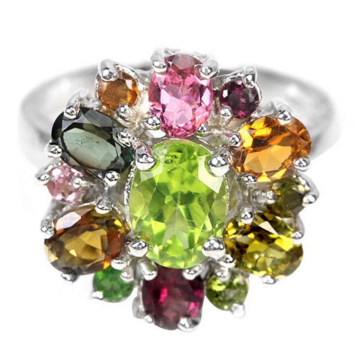 NATURAL PERIDOT & MULTI COLOR TOURMALINE 925 SILVER RING 14K WHITE GOLD COATING; RING SIZE7.75 ( resizable )ITEM QUANTITY1STONE SHAPEOVAL & ROUNDSTONE DIMENSION8 X 5.8 X 4.2 MM. , 5 X 4 MM. & 2.5 MM.ITEM WEIGHT5.9 GRAMCOLORMULTI COLORCLARITYIF, VVS - VSLUSTERDAZZLINGTREATMENTUNHEATEDORIGIN OF STONEAFRICA & ASIAHARDNESS6.5 - 7.5FACE OF RING 17 X 17 MM.
